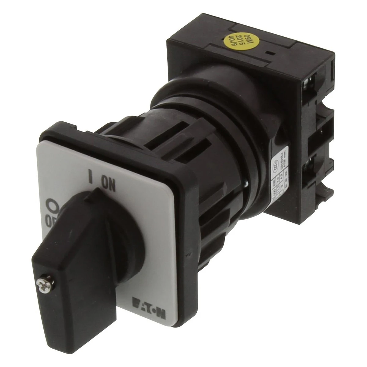 On-Off switch, Product range: On-Off switch, Part group reference: T0, with black thumb grip and front plate, 2 pole, Degree of Protection: Front IP65, Design: centre mounting, Switching angle: 90 °, Switching performance: maintained, front plate: 0-1, Motor rating AC-23A, 50 – 60 Hz 400 V: P = 5.5 kW, Rated uninterrupted current: Iu = 20 A, 1 contact unit(s), Standards: IEC/EN 60947, VDE 0660, IEC/EN 60204, CSA, UL, Switch-disconnector according to IEC/EN 60947-3 · · · built-in device fixed built-in technique device construction · · 1 second rated short-time withstand current · · Centre mounting · · Rated voltage 690 V a.c., rated current up to 315 Amps · · Rated Impulse Withstand Voltage: 5kV · · There is a mechanical state indicator and a test function button on the front face. · · The Ue rated operational voltage is 24VAC to 415VAC or 24VDC to 130VDC. The operating frequency is 50Hz or 60Hz. · · The Ie rated operational current is 6A under 24VDC, 2A under 48VDC, 1.5A under 60VDC, 1A under 130VDC. · · The Ie rated operational current is 6A under 24VAC to 240VAC, 3A under 415VAC.