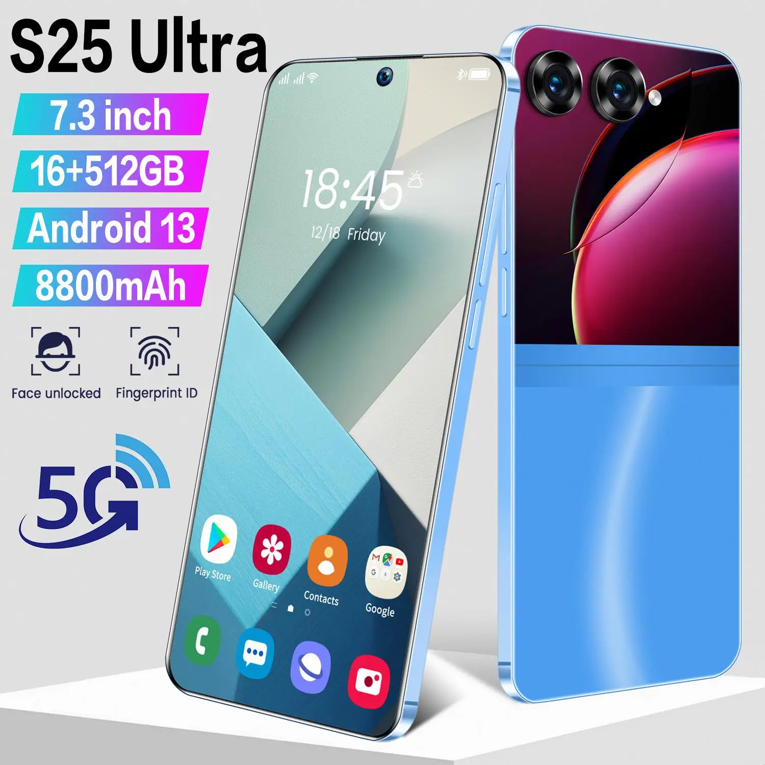 1.Model No. s25 ultra+ 2.The Platform MTK6888 3.Standby application Dual sim card (A slot support sim card or TF card) 4.Screen 7.3 HD+ Dewdrop Display 1440*3040 5.Speaker 1511 Box Speaker 6.Frequency GSM850/900/1800/1900mhz, 3G WCDMA850/1900/2100mhz, 4G LTE, 5G 7. Vibration Support 8. Colors White/Black/Blue 9. The Memory 16gb + 512gb ROM 10. Multi Media MP3 / MP4/3 gp/FM Radio/ 11. Camera 48 mp + 72 mp 12. Multi Function Full Screen,Fingerprint Face Recognition, Dual SIM, Wifi, GPS, Gravity Sensor, Alarm,Calendar,Calculator,Audio Recorder,Video Recorder, WAP/MMS/GPR, Image Viewer, e-Book,World Clock,Tasks Card rear flash IML rear Cover 13. Languages Multi – language support 14.Others Android OS 12.0 System The Type – C plug-in Ultra unibody Company Information