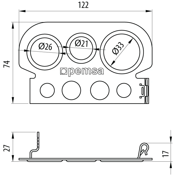 Pemsa UK 67010040 Bracket Multi Conduit Gland Zinc · · · Product: Bracket · · Type: Conduit Gland · · Perforated: N · · Material: Steel · · Finish: Electrogalvanised · · Length Min Max: 122 mm · · Nominal Width: 74 mm · · Height: 27 mm · · Minimum Operating Temperature: -50 Degrees C · · Maximum Operating Temperature: 150 Degrees C