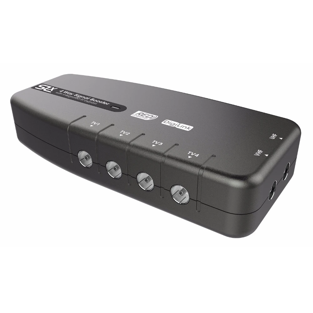 PHILEX SLx TV Signal Booster watch and control your Sky box in 4 additional rooms. Integrated IR bypass is compatible with Digi Eye remote control extenders. · · · Distributes HD TV, DAB and FM signals · · 2 Inputs – 1x TV signal and 1x DAB/FM · · 4 Output – suitable for up to 4 additional TVs/radios · · 10 dB Gain ideal for long cable runs or weak signals · · RED Compliant – updated to improve signal handling