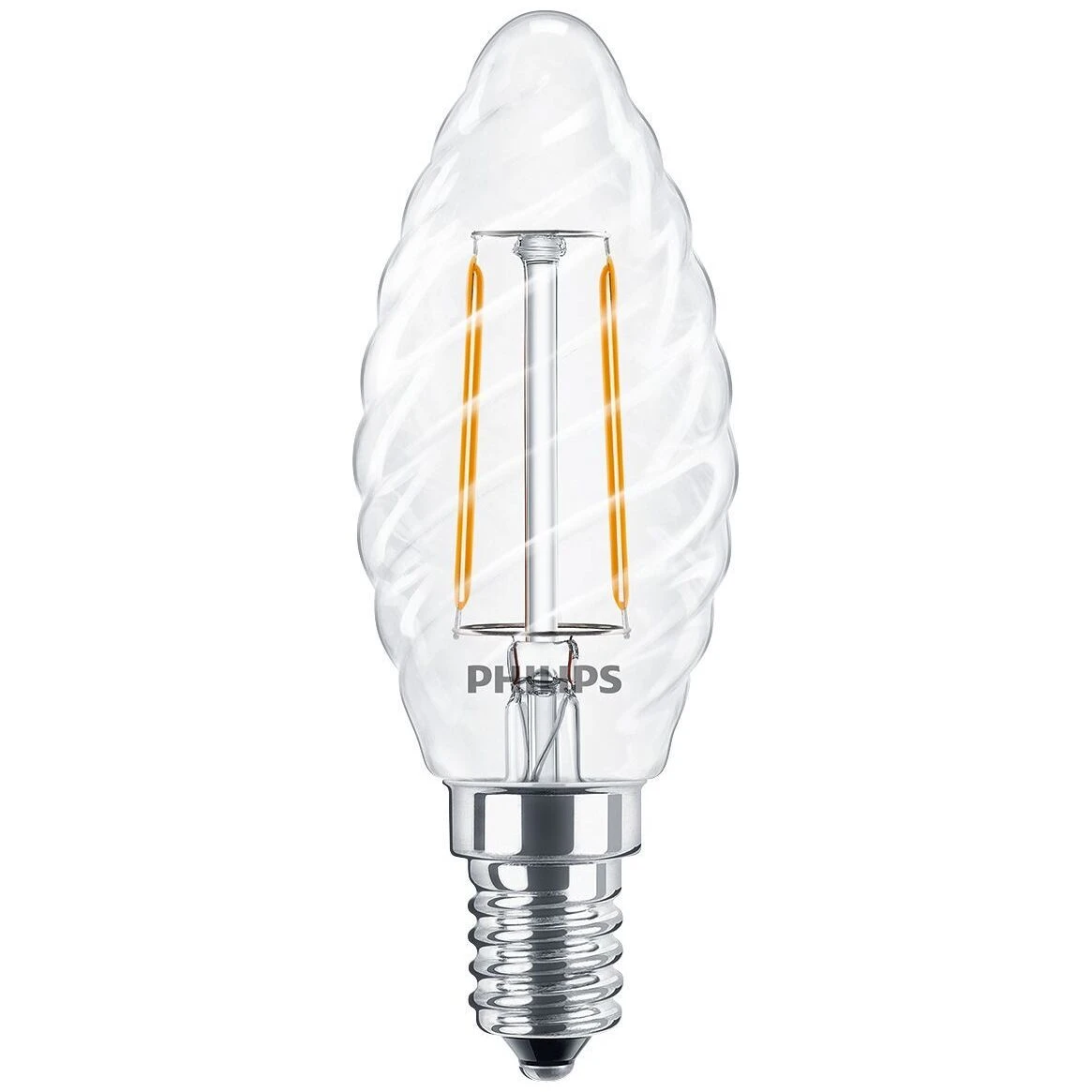 Featuring a classic heritage design, these filament LED candles combine the familiar shapes of classic incandescent bulbs with the benefits of long-lasting LED technology. The LED candle bulb is a very easy choice for people who are looking for a retrofit LED replacement, it provides 90% energy savings compared with conventional lamps. CorePro Glass LED bulbs provide excellent quality of light for stairway lighting. The LED candle bulb offers a lifetime of 15,000 hours to reduce maintenance costs. · · · Cap base: E14 · · Nominal lifetime: 15,000 h · · Lighting Technology: LED · · Flux measurement reference: Sphere · · Luminous Flux: 250 lm · · Luminous efficacy (rated) (nom.): 125.00 lm/W · · Colour consistency: <6 · · Colour rendering index (CRI): 80 · · LLMF at end of nominal lifetime (nom.): 70 % · · Flickering value (PstLM): 1