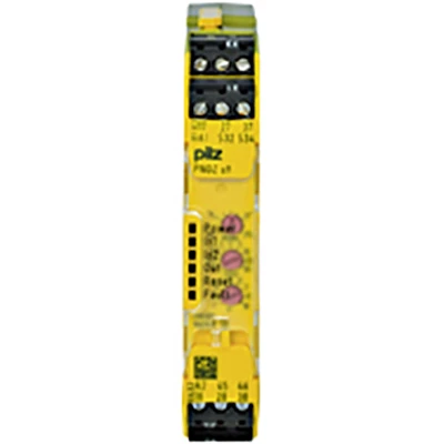 Pilz safety relay applicable for instantaneous contact expansion and delayed contact expansion. This relay also has a safe delay-on energisation/de-energisation timer as well as a safe pulsing timer. · · · Supply Frequency 50/60Hz · · Selectable times: 0.04s – 90s · · Power Consumption: 2 W · · Number of delayed safety contacts: 3 · · Number of auxiliary contacts: 1 · · Terminal Style: Plug-in · · Terminal type: Screw terminal · · 6 A Conventional enclosed thermal current · · Mounting support: DIN Rail · · IP20/40/54 Degree of protection