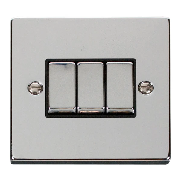 Plate Switch 3 Gang 2 Way 10A Polished Chrome Black Insert Victorian