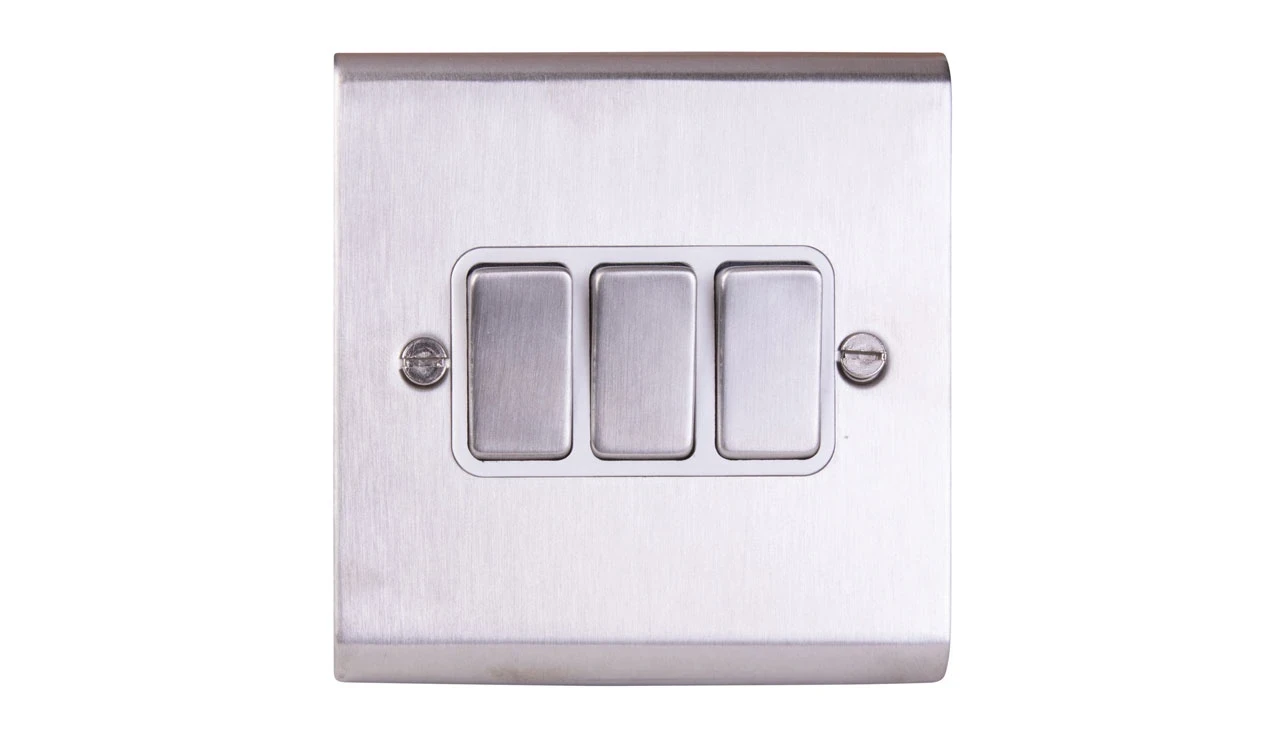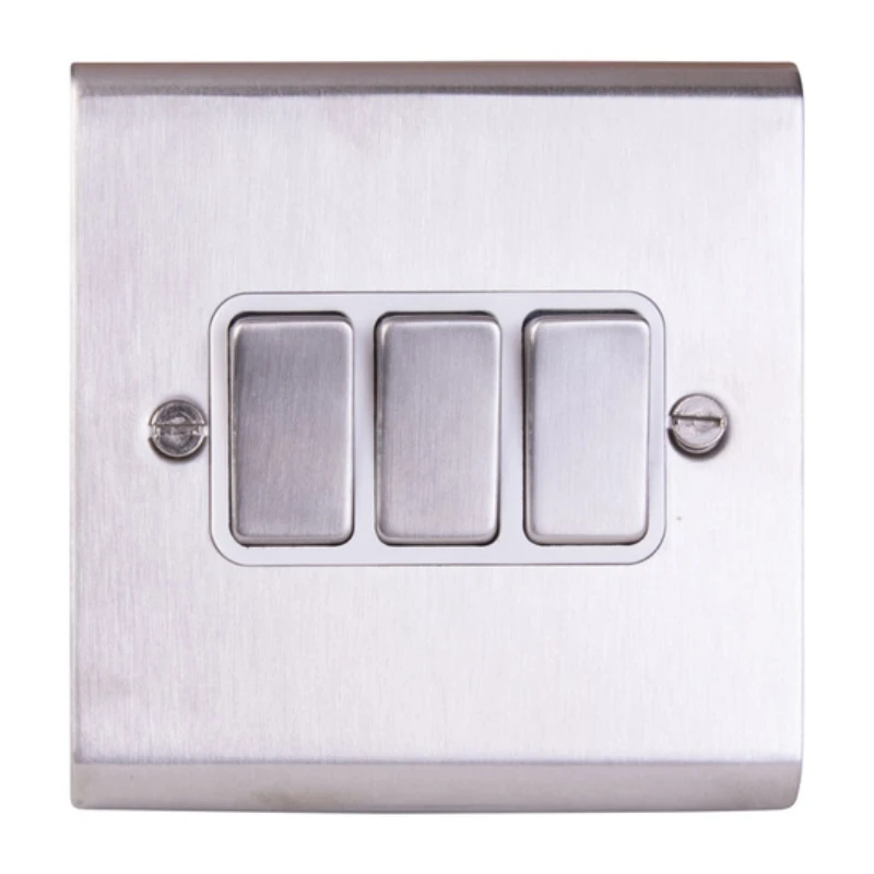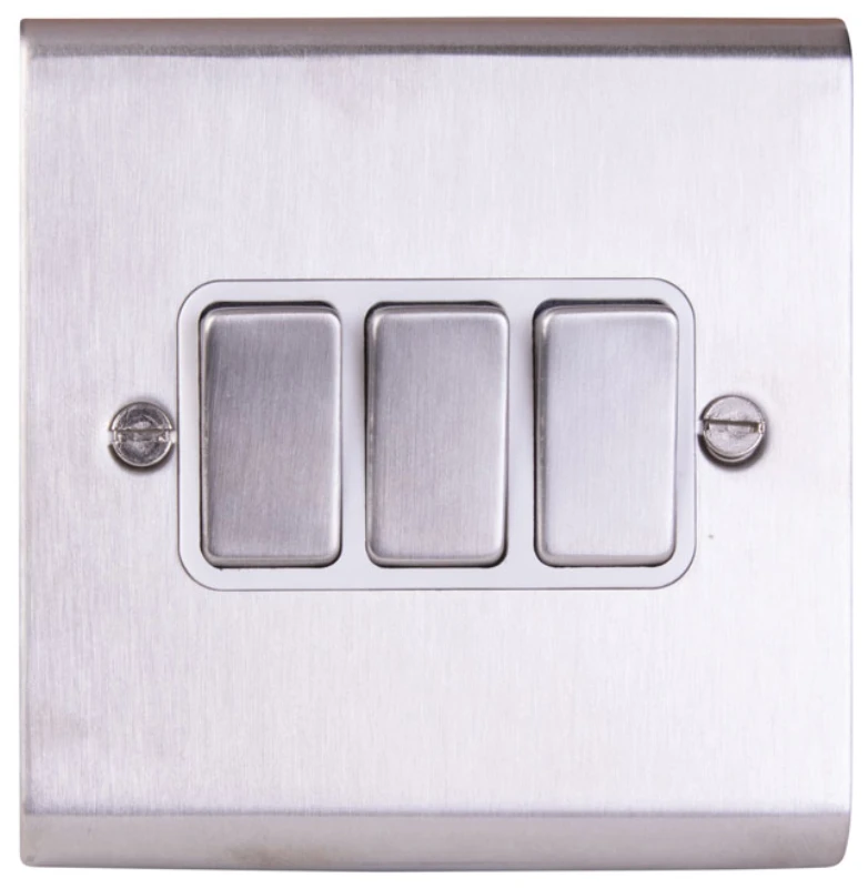 Plate Switch 3 Gang 2 Way White Insert 10A Stainless Steel