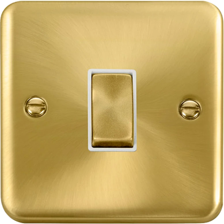 Deco plus rounded profile satin brass white insert 10AX ingot 1 gang 2 way plate switch. · · · Dimensions 88mm (W) x 88mm (H) x 8mm (D) · · Plate Design & Finish Rounded Profile Satin Brass · · Insert & Gasket Colour White · · Front Plate: Stainless Steel · · Maximum Voltage 250V · · Load Rating 10AX (Suitable for Inductive Loads) · · Plate Fixing Centres 60.3mm · · Terminal Size 3.5mm · · Terminal Torque 0.5Nm · · Terminal Capacity 4 x 1.5mm