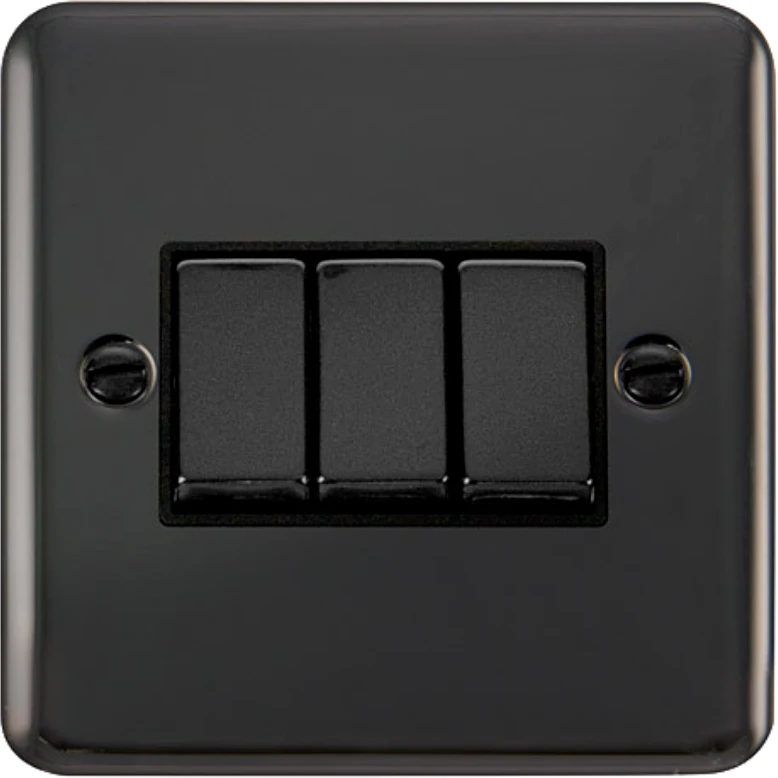Rounded profile black nickel 10AX ingot 3 gang 2 way plate switch. · · · Plate Dimensions (mm) 88 (W) x 88 (H) x 8 (D) · · Style Rounded Profile · · Finish Black Nickel · · Insert Colour Black · · Gasket Colour Black · · Anti Microbial Certified No · · Rated Voltage (V) 250 · · Inductive Load Rating (AX) 10 · · Load Rating Comments Suitable for Inductive Loads · · Termination Type Screw