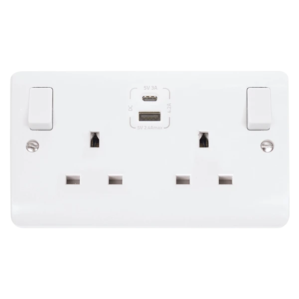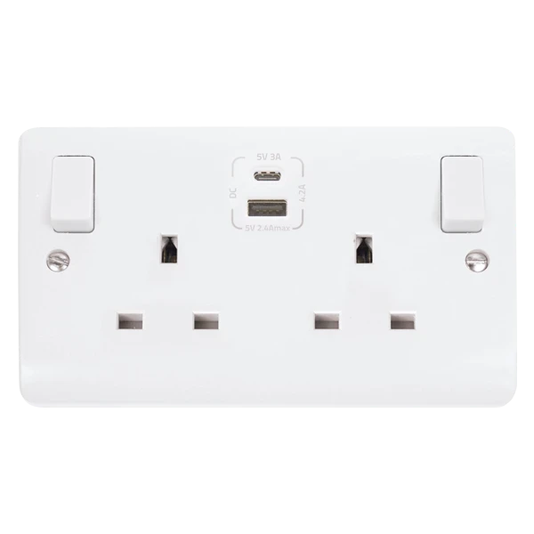 Polar White Mode 2 Gang 13A 1x USB-A 1x USB-C 4.2A Switched Socket