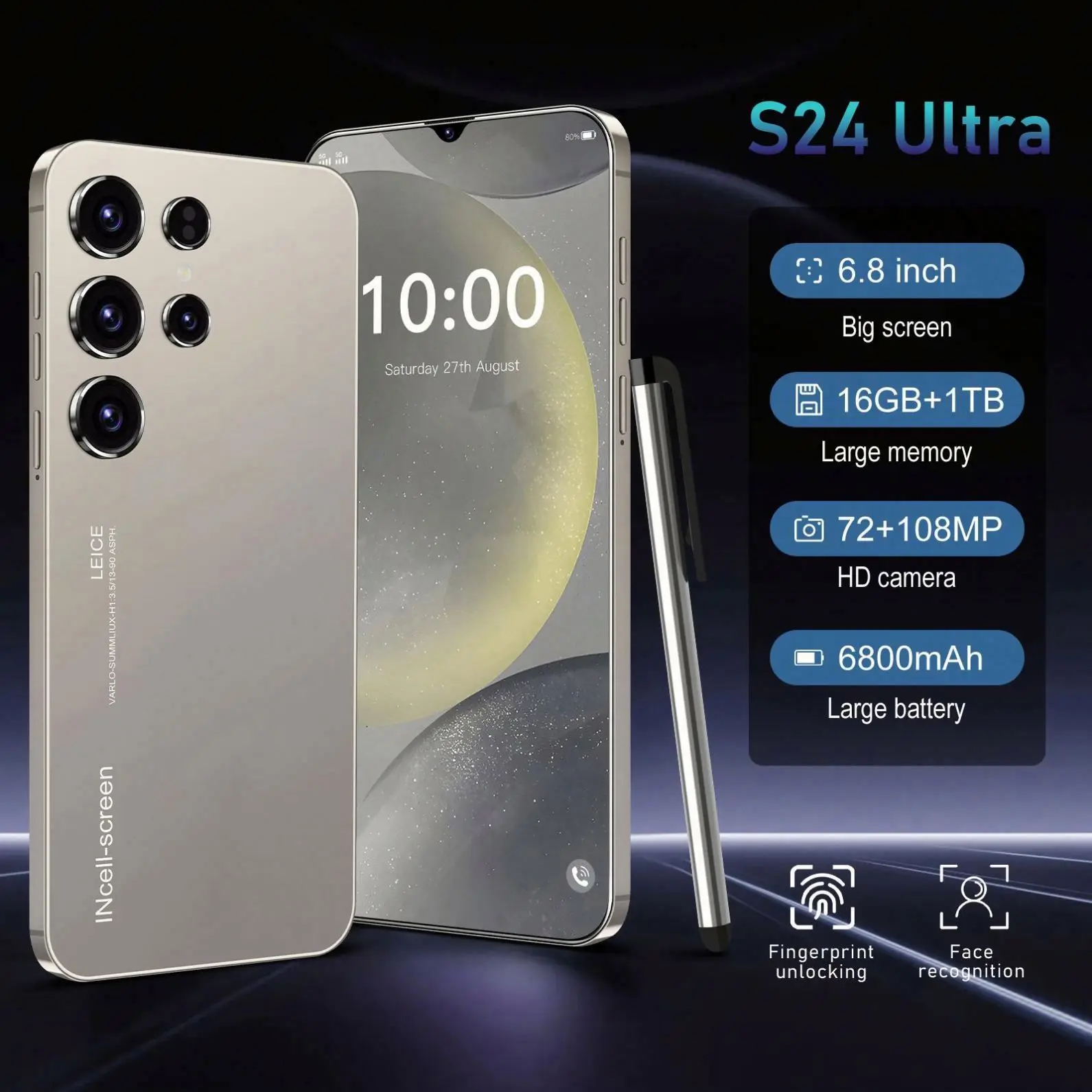 Product Name S24 ultra Standby Dual sim dual standby(A slot support SIM card, another slot support SIM card or TF card) Screen 6.7HD+ 1440 * 3040 Package Included 1 x Smartphone, 1 x Charger Adapter 1 x Headphones, 1 x User Manual 1x phone case 1x Protection film 1x Pen Frequency GSM850/900/1800/1900MHz, 3G: WCDMA850/2200MHz, 4G 5G LTE Colors Blue, Black,Gold Multi Function Full screen, Face recognition,Screen finger print, Dual SIM, Wifi, GPS, Gravity Sensor, Alarm ,Calendar ,Calculator ,Audio recorder ,Video recorder, WAP/MMS/GPR, Image viewer,E-Book,World clock,Tasks card rear flash IML rear cover