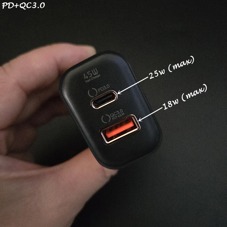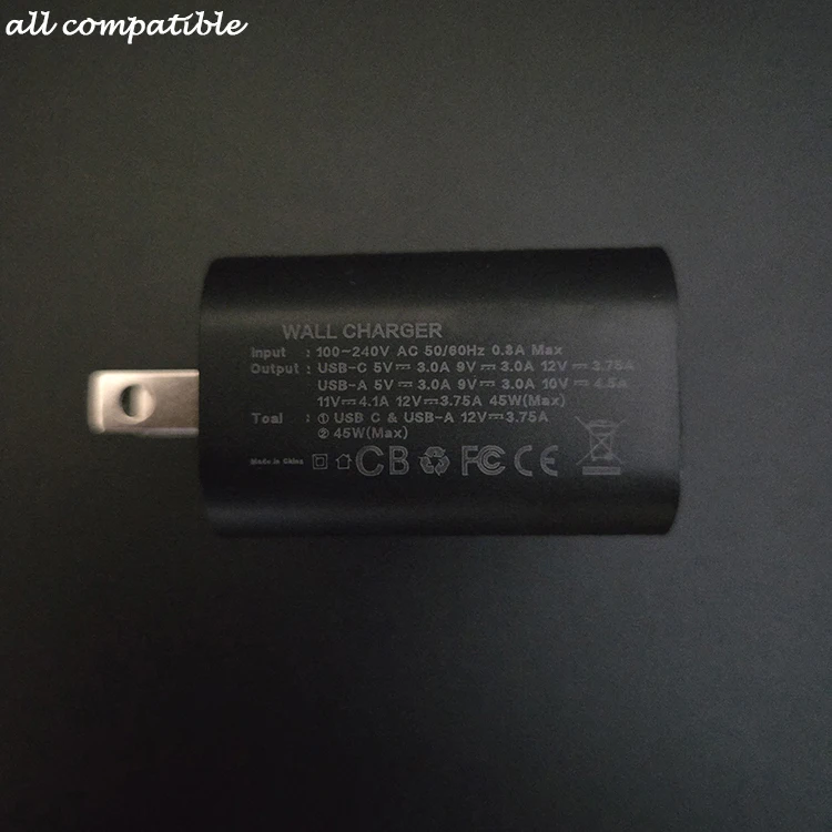 portatil circuit motherboard cargadores para celulares PD 45w GaN USB Type C travel power adaptors Name: PD 45w GaN USB Type C travel power adaptors Input: 100-240V AC 50/60Hz 0.8A Max Output: USB-C 5V-3.0A 9V-3.0A 12V-3.75A USB-A 5V-3.0A 9V-3.0A 10V-4.5A 11V-4.1A 12V-3.