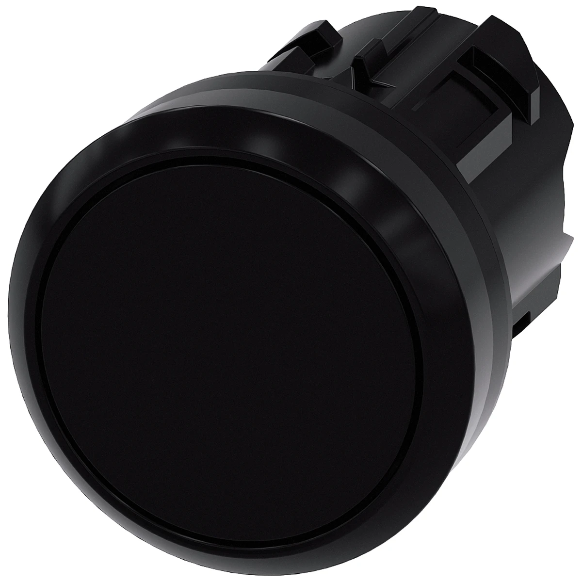 Siemens standard round pushbutton made up of a plastic actuator surrounded by a black plastic ring. The mounting diameter is 22.3mm whereas the actuating element has a 29.5mm diameter. · · · Manner of function: Momentary · · Type of unlocking device: None · · Mechanical sevice life: 10000000 cycles · · Maximum operating frequency: 3600 1/h · · IP66/67/69 Degree of protection · · Vibration resistance: 5g (10-500Hz) · · Shock resistance: 50g · · Ambient temperature: -25 to 70°C