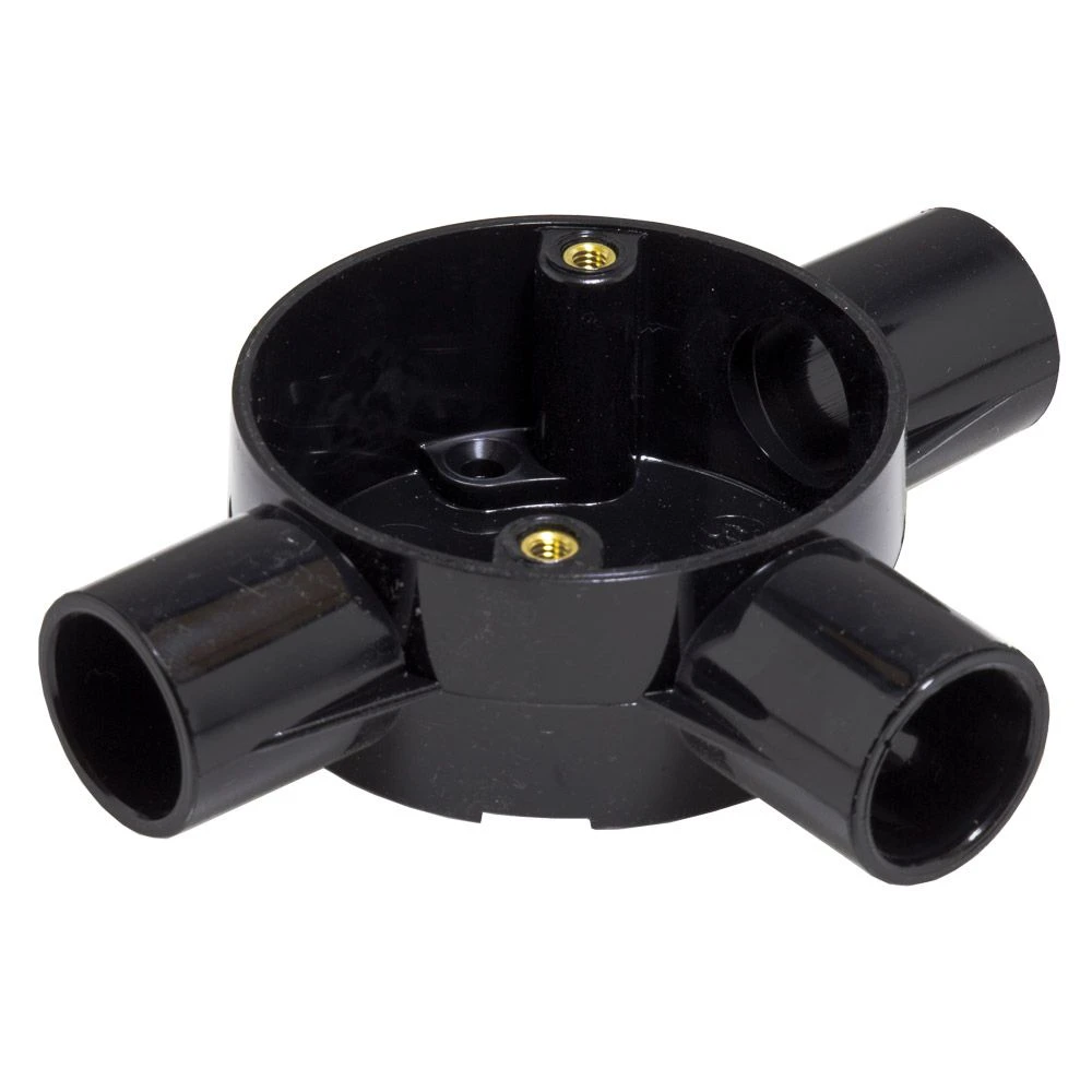 Circular T-Connection conduit box made up of a black polyvinyl chloride (PVC) housing body, designed for use as an accessory for electrical conduits. Suitable for use in industrial and commercial environments and is capable of suspending load of up to 3kg · · · Durable and impact resistant · · Easy to assemble and install · · Fixing centre is 50.8mm and fitted with M4 brass insert. · · Provision for MET1 brass earth terminal · · All boxes have threaded brass inserts · · Manufactured using 100% recycled material