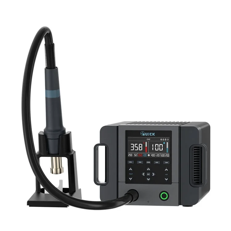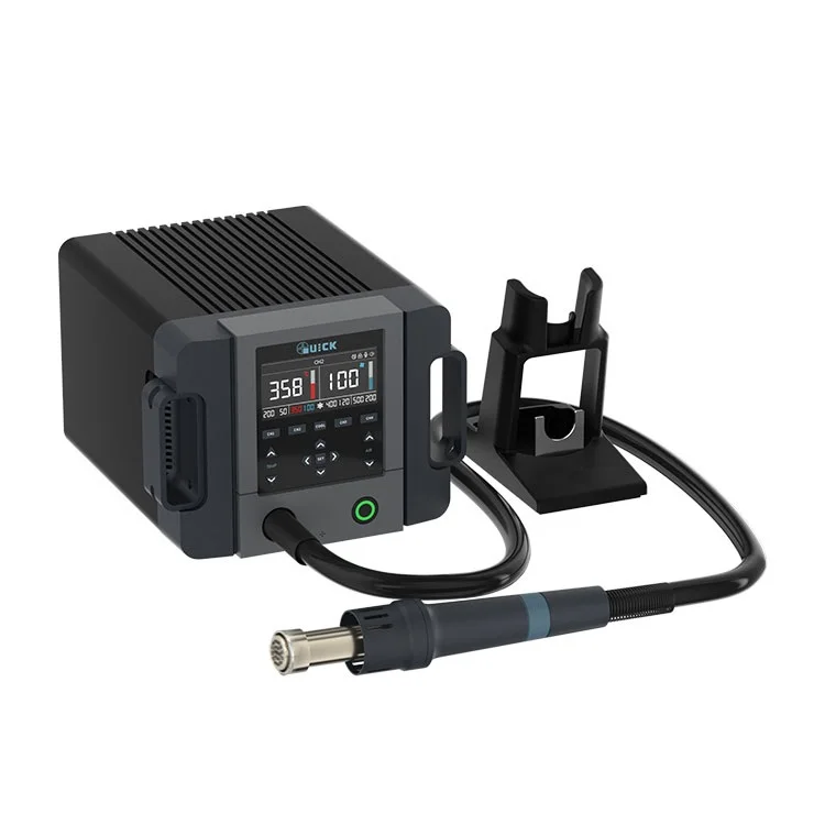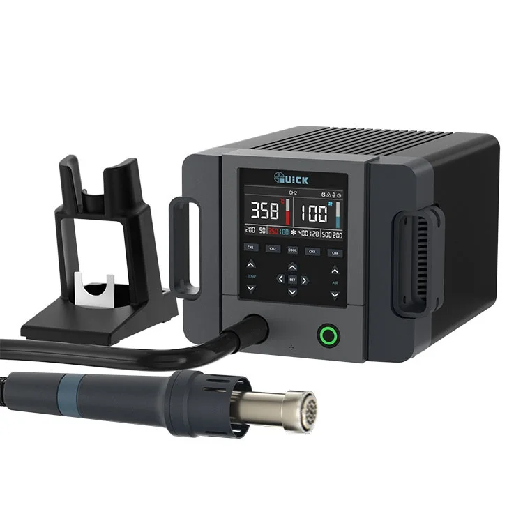 QUICK 861 PRO 220V/110V Smart Hot Air Desoldering Station for Mobile Phone Motherboard IC Chip PCB Digital Display Repair Tools Product Description QUICK 861 PRO 220V/110V Smart Hot Air Desoldering Station 1. 1300W high power,Intelligent PID linear temperature. 2. Full viewing angle HD color screen,Dynamic temperature display. 3. AI voice control,Free your hands and move freely. 4. Using brushless vortex fan,Long life and low noise,70L/min large air volume,Low pressure. 5. Cooling hibernation,Protect hot air handle,Extend heating core life. 6. Compact handle, ergonomically designed. Specifications Model QUICK 861 Pro Power 1300W Voltage AC220V/110V Display type OLED Temperature Range 50 ~ 550℃ Air volume 70L/Min(Max) Air volume adjustment range Level 1~ 200 Nozzle NK1130W45 NK2064W45 NK2084W45 NK2127W45-01 Mini Dimensions 214 (L) * 235 (D) *159 (H) mm Weight About 4.3KG Detailed Images Packaging list QUICK 861Pro Host 220V/110V*1pcs Heat gun handle*1pcs Air gun stand*1pcs Nozzle*4pcs Ground wire*1pcs Power cord*1pcs Instruction manual*1pcs