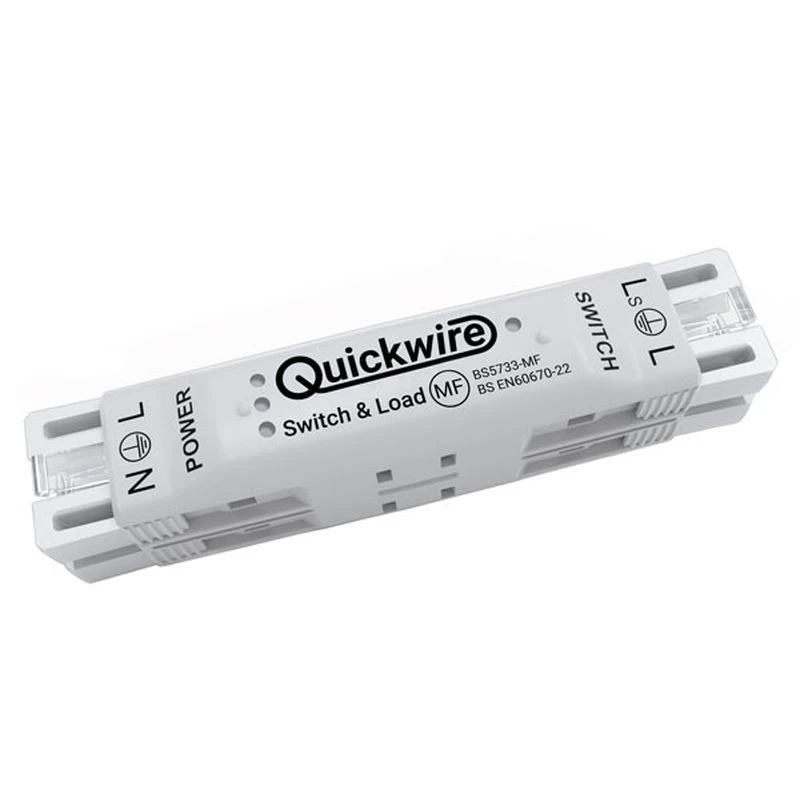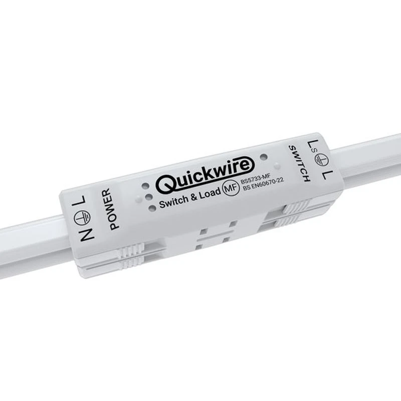 The Quickwire Switch & Load allows for two power connections, one switch connection and one load connection. Use the first power inlet to connect power to your circuit. Plug-in your luminaire and switch cable to complete your circuit. Each cable inlet is prewired, and labelled for quick and simple identification. To take power on to a new circuit/room simply connect another Switch and Load using the second power inlet. If you want to connect multiple luminaires you can use a Quickwire Splitter · · · 16A 250Va.c. · · Overcurrent protection limited to 16A · · BS EN 60670-22 · · BS 5733-MF · · IP30 · · 1.0mm² – 1.5mm² Twin & Earth (CPC) Solid cores Class 1 (conductors)