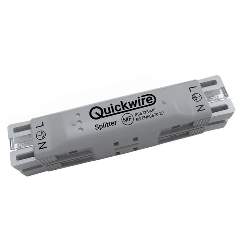 The Quickwire Splitter is for use in conjunction with a Switch & Load. It allows for connection of multiple luminaires. Connect to the ‘load’ inlet of your Switch & Load to create three separate ‘load’ connections. If your circuit has more than three luminaires then use one inlet on your initial Splitter to connect another Splitter. Repeat as needed. · · · 16A 250Va.c. · · Overcurrent protection limited to 16A · · BS EN 60670-22 · · BS 5733-MF · · IP30