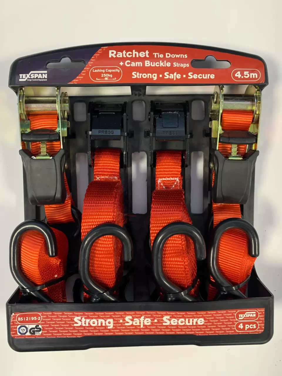 TEXSPAN Ratchet Tie Down + Cam Buckle Straps 4.5m LC 250kg 4pcs, Retail Pack, Galvanised ratchet assembly with polyester webbing 25mm. · · · Material: Polyester, Steel · · Marking: According to standard · · Standard: EN 12195-2 · · Secure a wide variety of loads, from light to heavy · · Protect your cargo from damage · · Increase safety and efficiency