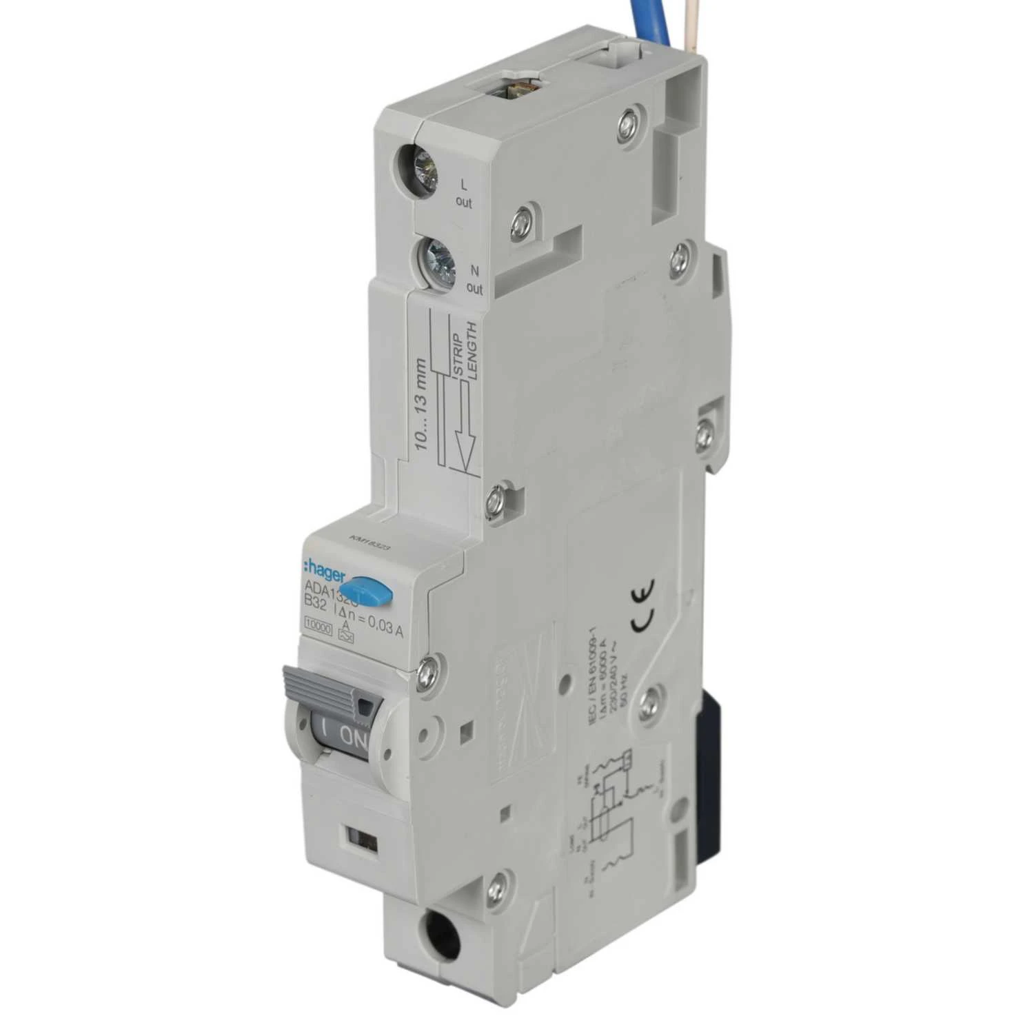 This is a single pole, single module RCBO (Residual Current Breaker with Overcurrent protection) with a rated current of 32A, a breaking capacity of 10kA, and a residual current sensitivity of 30mA. This means that it can protect your circuits from both overcurrent and earth faults, and is suitable for a wide range of applications. · · · Neutral position right · · Fixing mode DIN rail type O (symmetrical) · · Curve B · · Rated operational voltage Ue 230 / 240 V · · Frequency 50/60 Hz · · Type of supply voltage AC · · Rated insulation voltage 250 V · · Rated residual operating current 30 mA