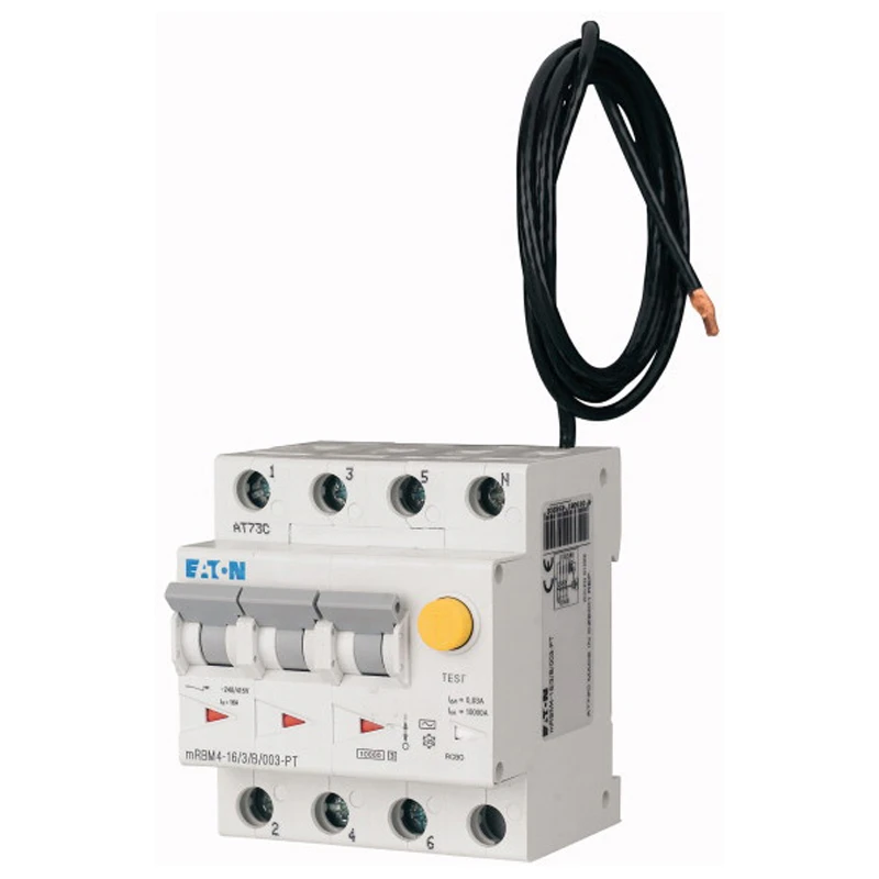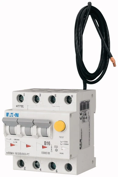 RCBO (residual-current circuit breaker with overload protection) mRBM4-UK-PT, 3 pole+N, Rated current In: 16 A, Rated fault current I?N: 0.03 A, Rated switching capacity according to IEC/EN 61009: 10 kA, Switchgear for residential and commercial applications · · · Rated breaking capacity 10kA · · Conditionally surge current-proof 250A · · Contact position indicator red – green · · Earth fault current tripping indicator white – blue · · Wide variety of rated tripping currents · · Free terminal space despite installed busbar