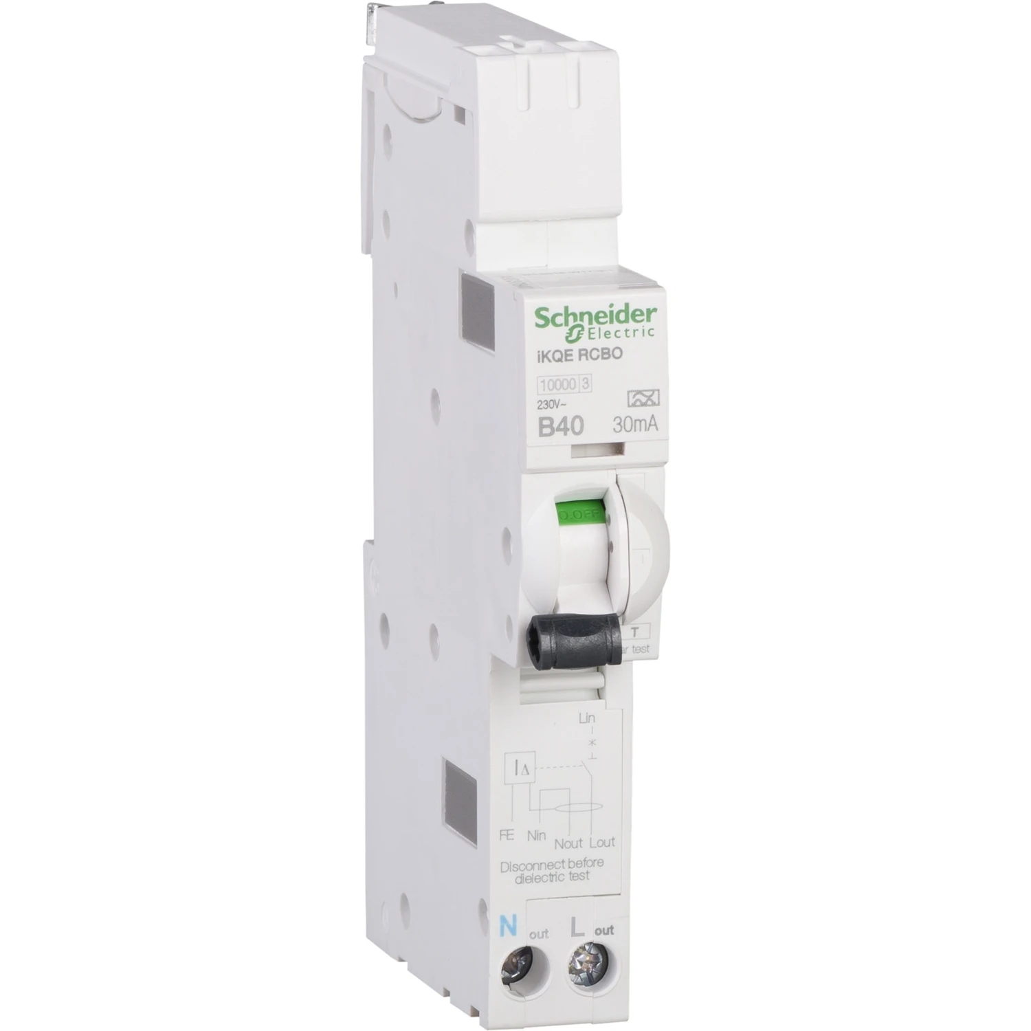 The Schneider LoadCentre KQ SEE140B03 is a 40 amp 30 milliamp single pole RCBO. This Schneider LoadCentre KQ RCBO has a click-in busbar for speed of installation and guaranteed connection, has a 10kA breaking capacity and has a trip free mechanism that operates even when the toggle is locked on. The LoadCentre KQ MCB’s are lockable in the on or off position and is suitable for any Schneider Loadcentre KQ A and B type distribution boards. · · · Compatible with Loadcentre KQ B Type boards · · Other RCBO options available · · Fast installation with click-in busbar · · The Icn rated short circuit breaking capacity is up to 10000A according IEC 61009-2-2 standard. · · Its unique Visitrip indicator reduces intervention time by showing the faulty circuit. · · Its Visisafe green strip guarantees the physical opening of the contacts to allow downstream maintenance. · · Its fast closing mechanism independent of manual operation improves its service life. · · This product is compliant with IEC 61009-1 and IEC 61009-2-2 standard. · · It has an electrical endurance going up to 10000 cycles and a mechanical endurance going up to 20000 cycles. · · The Ue operational voltage is 150VAC to 230VAC.