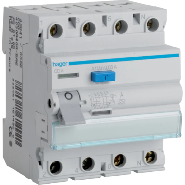 The Hager RCCB 4 Pole 63A 30mA A Class is a residual current breaker (RCBO) that provides protection against electric shock and fire. It is a four-pole breaker, meaning it can protect a three-phase circuit or two independent single-phase circuits. The breaker has a current rating of 63A and a residual current sensitivity of 30mA. This means that it will trip if the current flowing through the live and neutral conductors of a circuit is not equal. This can happen if there is a fault to ground or if a person comes into contact with an energized conductor.The Hager RCCB 4 Pole 63A 30mA A Class is a Class A breaker, which means it is designed to protect against both alternating current (AC) and direct current (DC) faults. It is also EN61008-1 compliant, which means it meets the latest safety standards. · · · Rated operational voltage Ue 230 / 400 V · · Rated residual operating current 30 mA · · Rating current 30C 63A · · Neutral position right