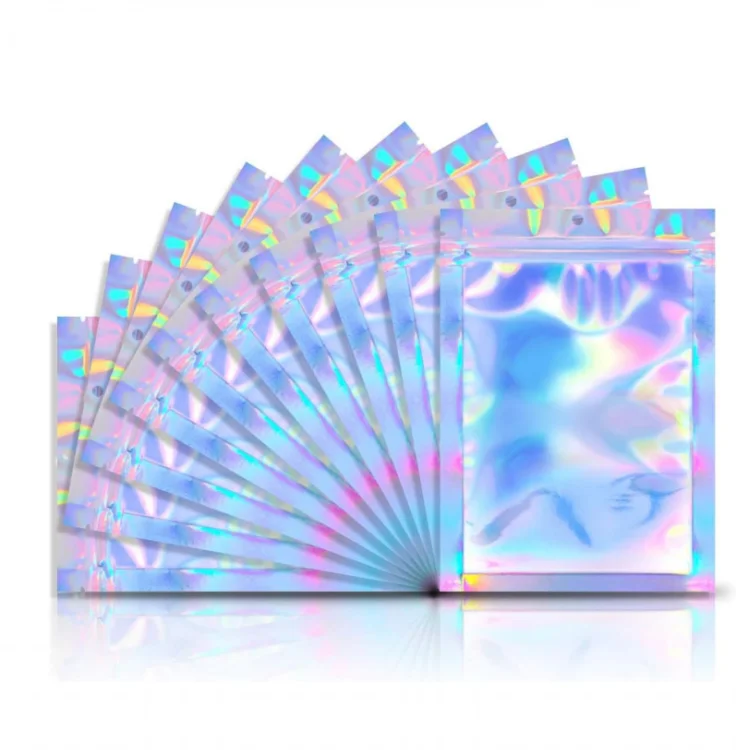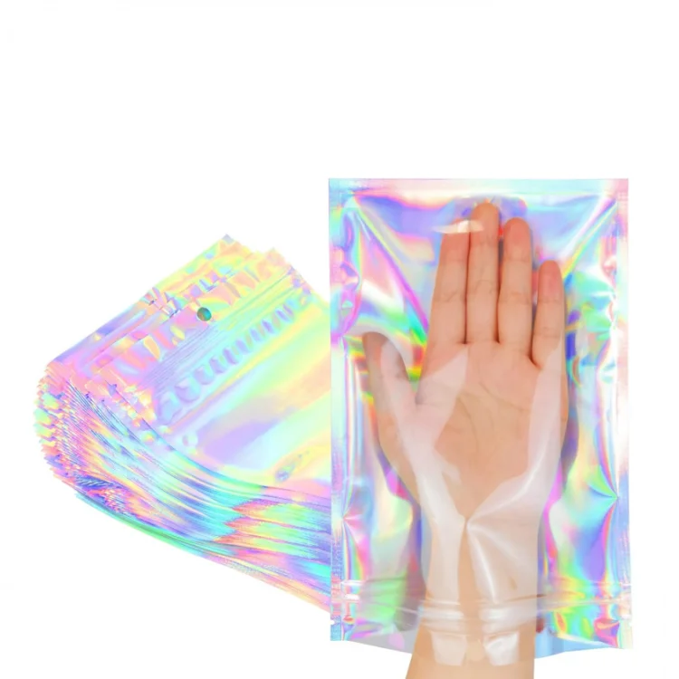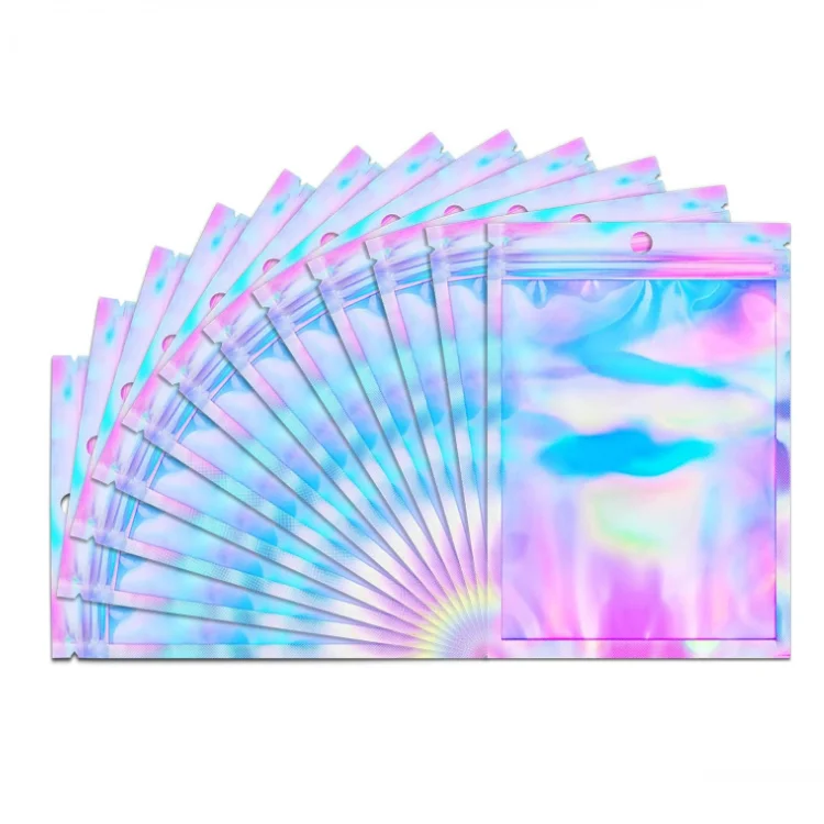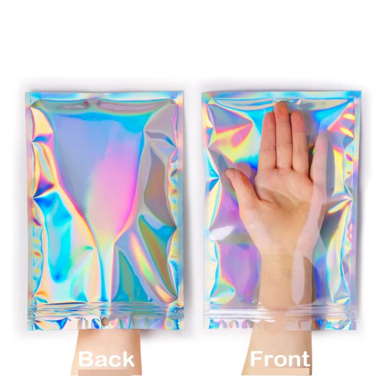 Item Name : Resealable Smell Proof Bags Holographic Mylar Bags Clear Window With Zipper for Small Business Food Storage Candy Size : Available sizes Thickness : Double sided 160 microns Printing Color : Up to 10colors by high speed gravure printing machine Basic material : Outside Layer :BOPP,