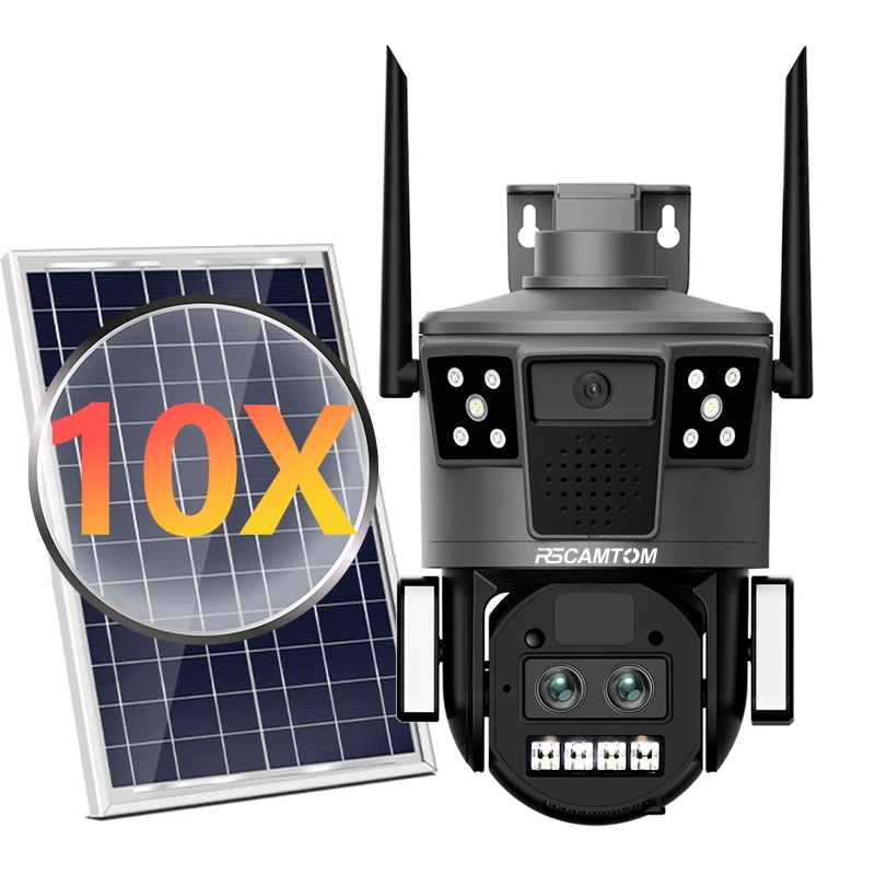 Rscamtom 6MP Outdoor Three Screen Solar Security Camera 10X Zoom Motion Detection Alarm 4G Solar Camera