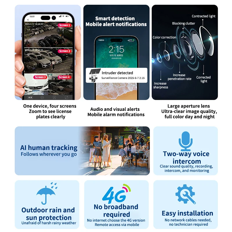 Rscamtom 99X Zoom Outdoor 4G Security Camera Solar CCTV Full Color Night Vision 24/7 Hours Recording Four Lens 4G Solar Camera