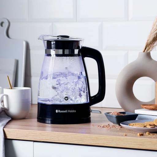 - 1.7l glass kettle with black plastic and stainless steel accents