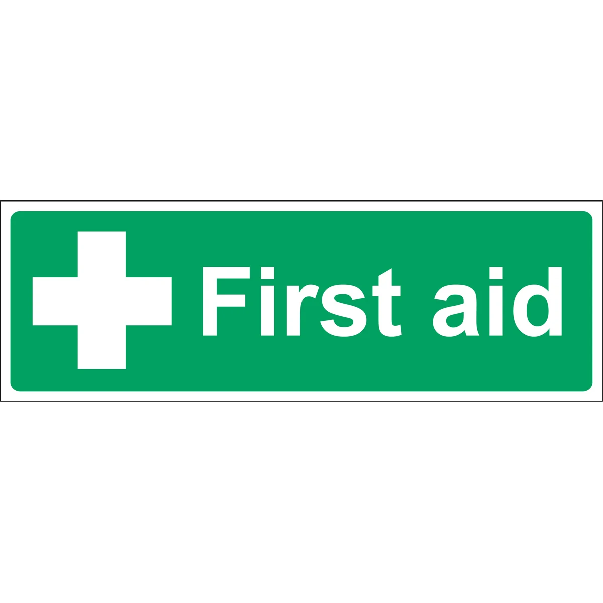 Health and safety sign with “First Aid” written in white on a green background which conveys information on safety and safe conditions. · · · Self adhesive sign · · White font on a green background · · Easy to read and understand · · Can be placed on a variety of surfaces · · Provides clear and visible indication of the location of first aid supplies · · Meets international safety standards