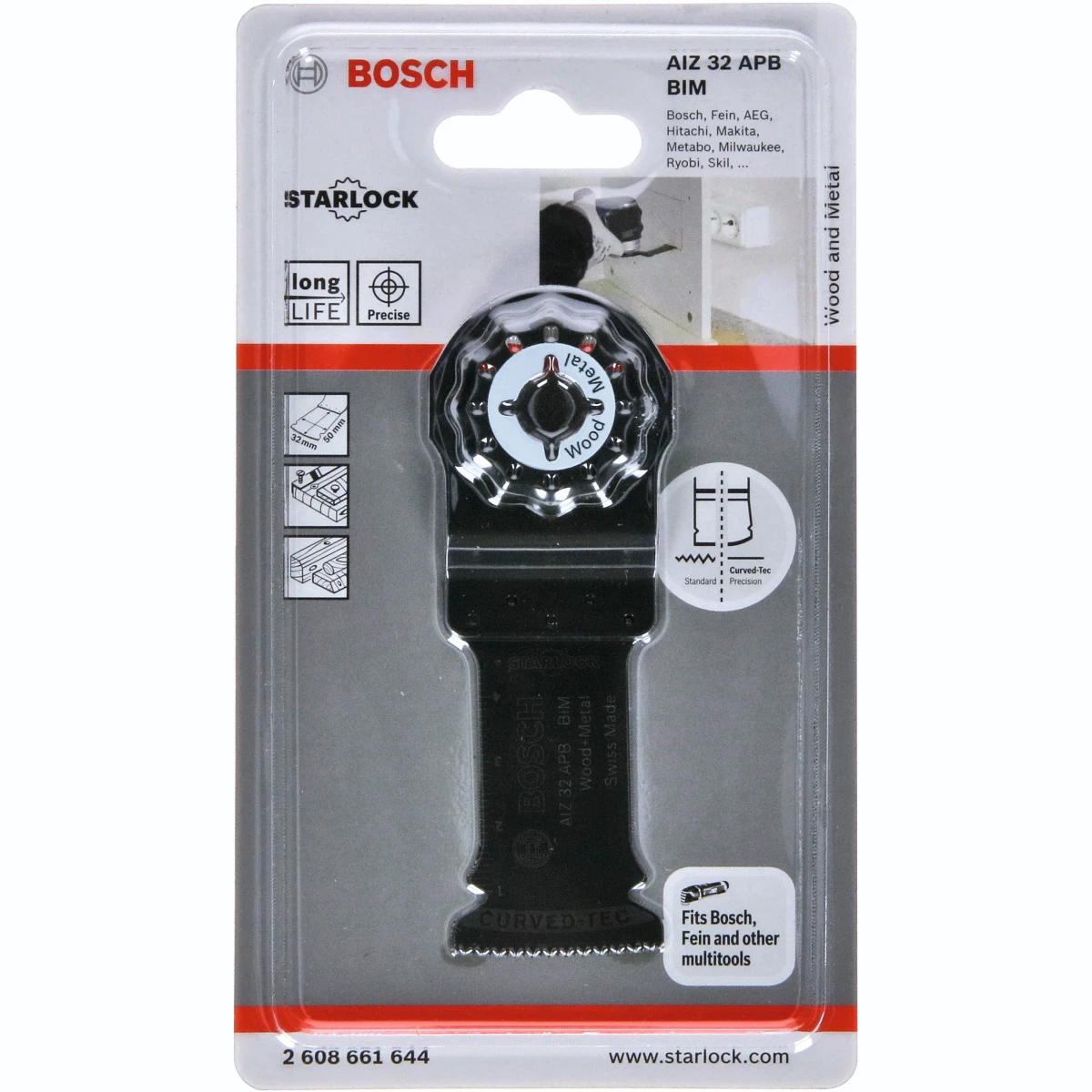 The Bosch Starlock AIZ 32 APB blade guarantees exact flush and deep plunge cuts in wood, metal and plastics. It cuts precisely right from the start thanks to a rounded cutting edge called Curved-Tec. The blade’s Starlock sturdy mounting system increases control for highly accurate cutting that transmits power directly and reduces wobbling. This versatile blade also cuts through very hard combined wooden and metal materials including non-hardened nails and screws, non-ferrous pipes and profiles with smaller dimensions. When cutting non-hardened metals and abrasive materials, the BIM (bi-metal) combination of an HCS (high carbon steel) blade and HSS (high-speed steel) teeth resists wear and heat, ensuring a long life for the blade. The Starlock Snap-In mounting system allows fast blade removal and exchange within 3 seconds without having to touch the blade. The mounting system produces the highest power transfer thanks to a 3-dimensional tight-fitting connection between machine and accessory. It is suitable for use with all Starlock, Starlock Plus and Starlock Max power tools as well as common multi-tools. · · · Precise Plunge Cuts in Wood and Metal · · BIM combination of HCS blade and HSS teeth resists wear and heat for longer life · · BIM combination of HCS blade and HSS teeth resists wear and heat for longer life