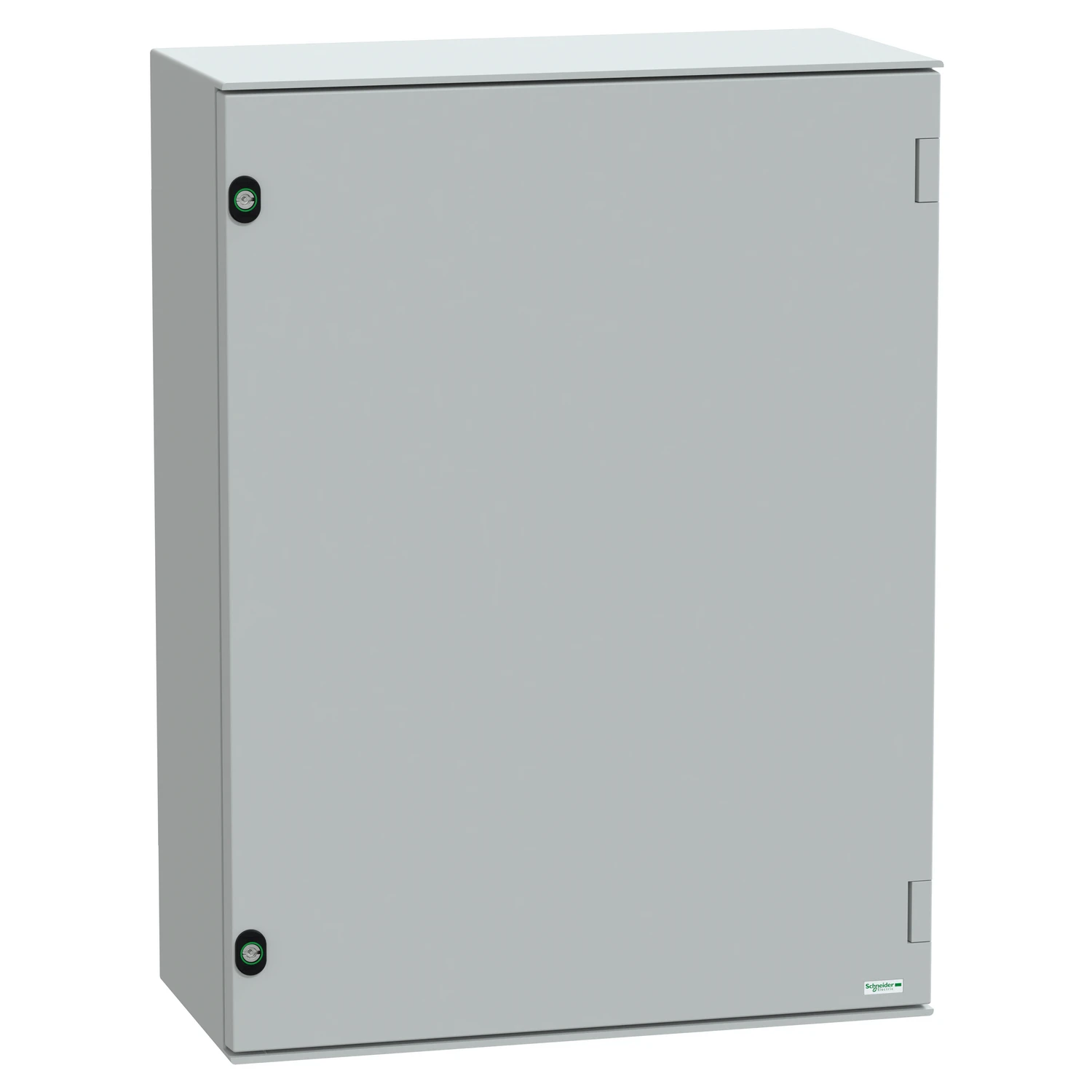 Wall-mounting encl. polyester monobloc IP66 H847xW636xD300mm+metal mount.plate. range: Thalassa – product name: Thalassa PLM – device short name: PLM – device application: multi-purpose – product or component type: compact enclosure – enclosure nominal height: 847 mm – enclosure nominal width: 636 mm – enclosure nominal depth: 300 mm – device composition: body 1, door 1, lock 2, mounting plate 1 – body type: built-in canopy, one piece moulded with notches in the rear – lock type: 3 mm double-bar lock. · · · Versatile wall-mounted enclosure suitable for various applications. · · Highly durable polyester-fibreglass construction for industrial and outdoor environments. · · Plain door design for easy visibility of equipment inside. · · Two 3mm double-bar locks on the front door for added security. · · High protection against dust and water with an IP66 rating. · · Resistant to impacts with an IK10 rating. · · Protection against electric shocks with class II electrical insulation rating. · · Suitable for ambient air temperatures ranging from -40 to 80°C without affecting performance.