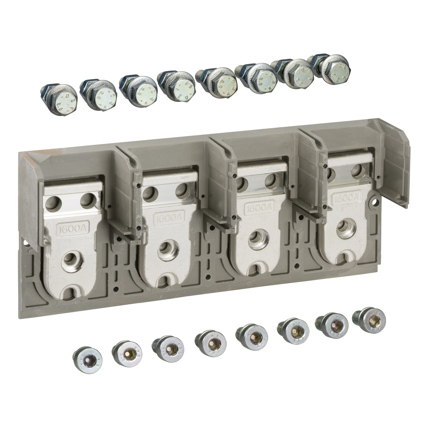 These accessories are front connections for 4 poles fixed Compact NS circuit breakers and fixed Compact NS switch disconnectors. They can be adapted to Compact NS 1600 circuit breakers with N/H breaking capacity codes. They can be adapted also to Compact NS 1600 NA switch disconnectors. These front connections terminals are designed for top mounting. They are equipped with M10 captive screws for direct connection of bars. Bare cable and cable with lugs can be adapted using some accessories. The pitch is 70mm and the terminal width is 44mm. They are sold by set of 4 parts. · · · These accessories are front connections for 4 poles fixed Compact NS circuit breakers and fixed Compact NS switch disconnectors. · · They can be adapted to Compact NS 1600 circuit breakers with N/H breaking capacity codes. · · They can be adapted also to Compact NS 1600 NA switch disconnectors. · · These front connections terminals are designed for top mounting. · · They are equipped with M10 captive screws for direct connection of bars.