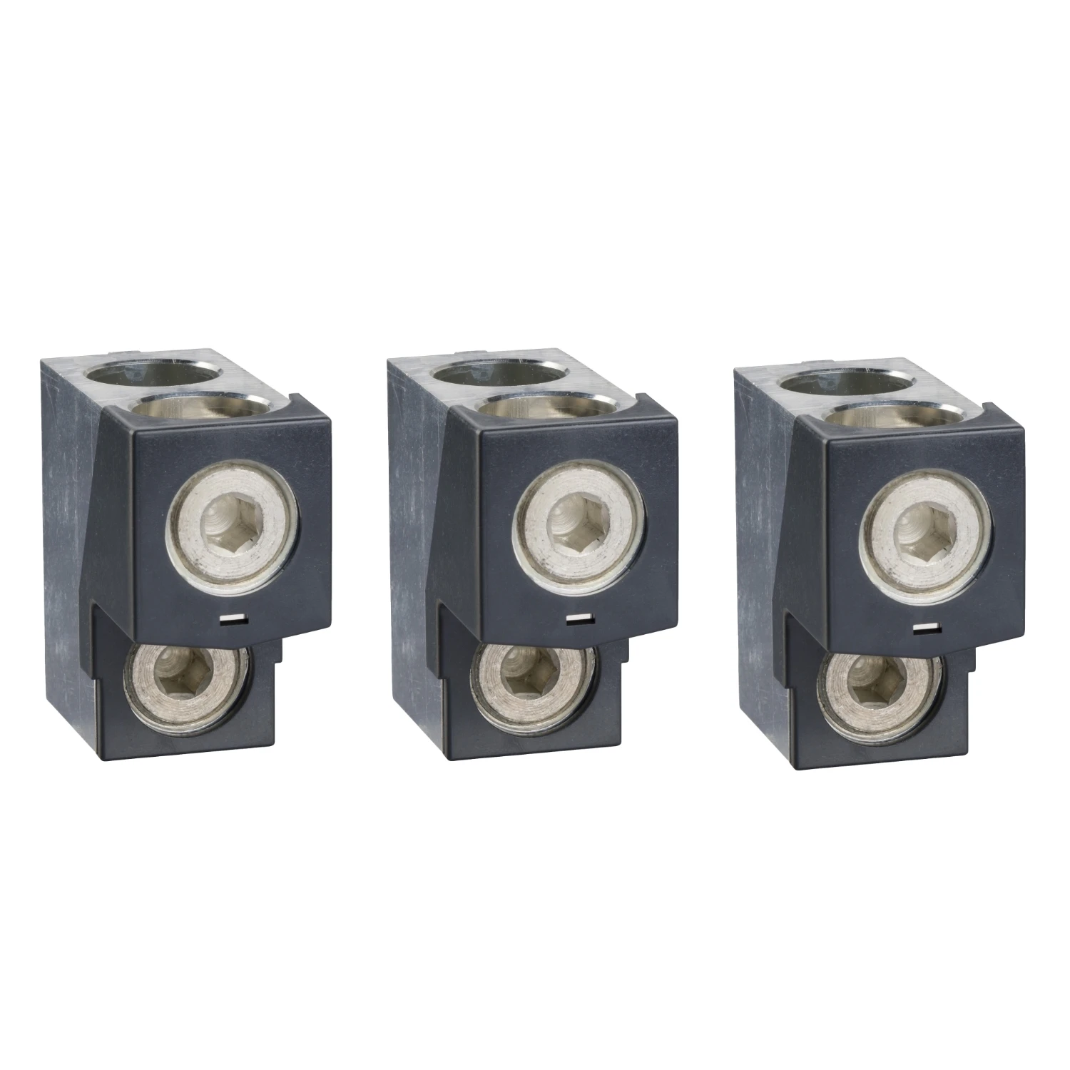 These accessories are aluminium bare cable connectors for Compact NSX 400/630 and EasyPact CVS 400/630. These connectors can receive 2 copper or aluminium cables from 35mm² to 240mm². The connectors are screwed directly on the device terminals or right angle terminal extensions. The rated current is up to 630 A. They are sold by set of 3 parts. · · · These accessories are aluminium bare cable connectors for Compact NSX 400/630 and EasyPact CVS 400/630. · · These connectors can receive 2 copper or aluminium cables from 35mm² to 240mm². · · The connectors are screwed directly on the device terminals or right angle terminal extensions. · · The rated current is up to 630 A.