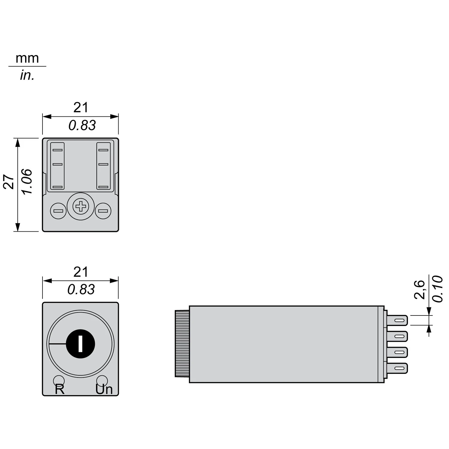 Technical Specifications  Technical Specifications Timer relay Depth 63 mm Nominal current 5 A Height 27 mm Width 21 mm Number of outputs, undelayed, normally closed contact 0 Number of outputs, undelayed, normally open contact 0 Number of outputs, undelayed, change-over contact 0 Number of outputs, delayed, normally closed contact 0 Number of outputs, delayed, normally open contact 0 Number of outputs, delayed, change-over contact 2 Rated control supply voltage at AC 50 Hz 0 – 0 V Rated control supply voltage at AC 60 Hz 0 – 0 V Time range 0.1 – 360000 s Rated control supply voltage at DC 12 – 12 V Suitable for DIN rail (top hat rail) mounting No With semiconductor output No Pluggable on auxiliary contact block No Outputs, reversible delayed/undelayed No Function delay on de-energization No Function floating contact on energization No Remote operation possible No Function delay-on energization Yes Function floating contact on de-energization No Function star-delta No Function pulse shaping No Function flashing, starting with pause, fixed time No Function flashing, starting with pulse, fixed time No Clock function, starting with pause, variable No Clock function, starting with pulse, variable No Suitable as remote control No · Technical Data Sheet – Click to Download