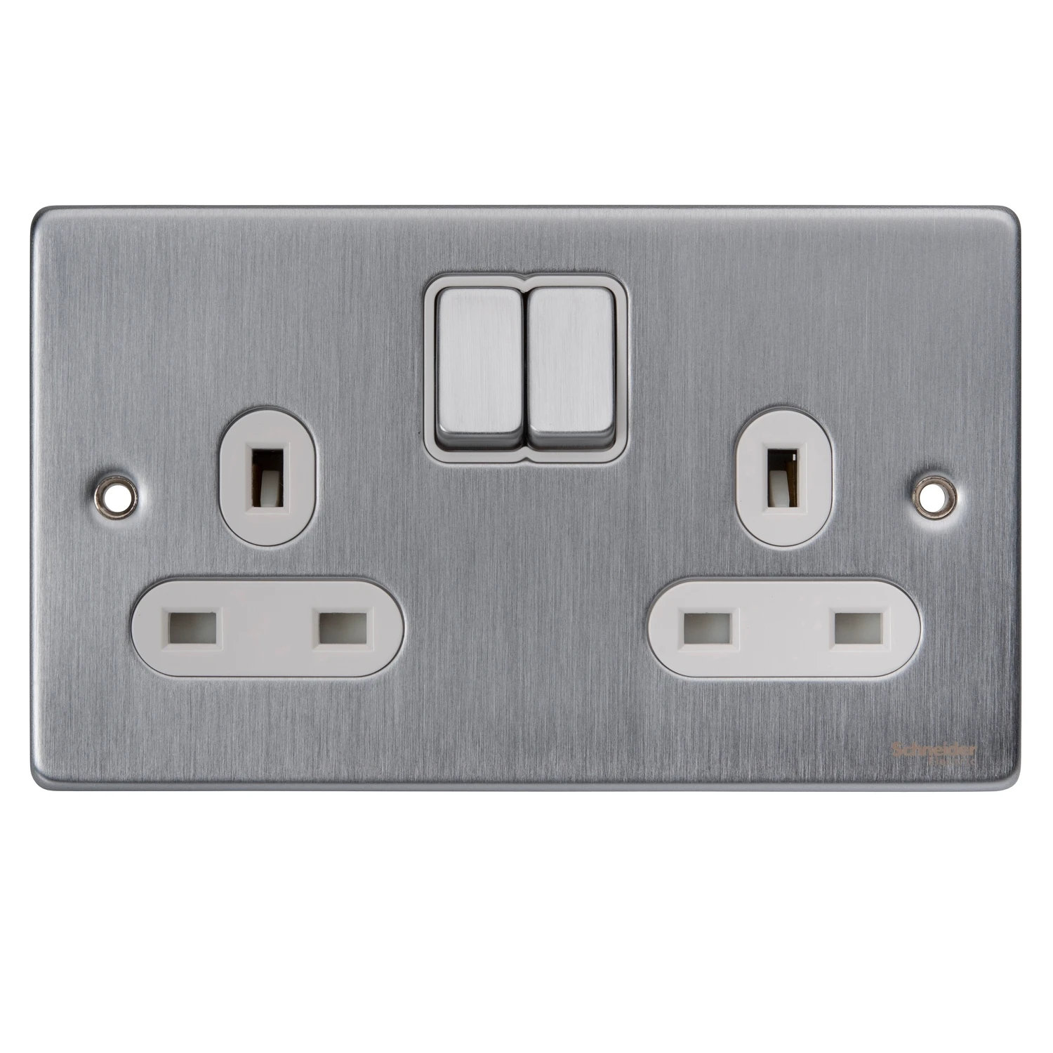 Schneider Electric Socket 2 Gang Single Pole Switched Low Profile 13A Brushed Chrome White Insert