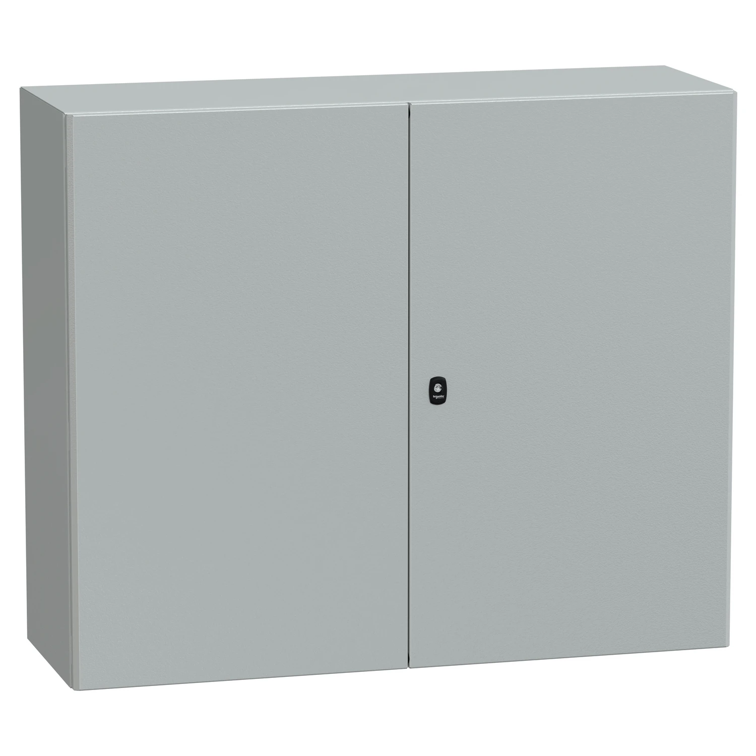 Spacial S3D wall mounted steel enclosure with 2 plain doors. 999 x 1200 x 400 mm. Single piece body, mounting plate included. 3-point closure system with handle and 3 mm double bar lock insert. Steel made, epoxy-polyester powder finish. Protection IP 55, IK10, Grey RAL 7035. · · · Spacial S3D wall mounted steel enclosure with 2 plain doors. · · 999 x 1200 x 400 mm. · · Single piece body, mounting plate included. · · 3-point closure system with handle and 3 mm double bar lock insert. · · Steel made, epoxy-polyester powder finish.