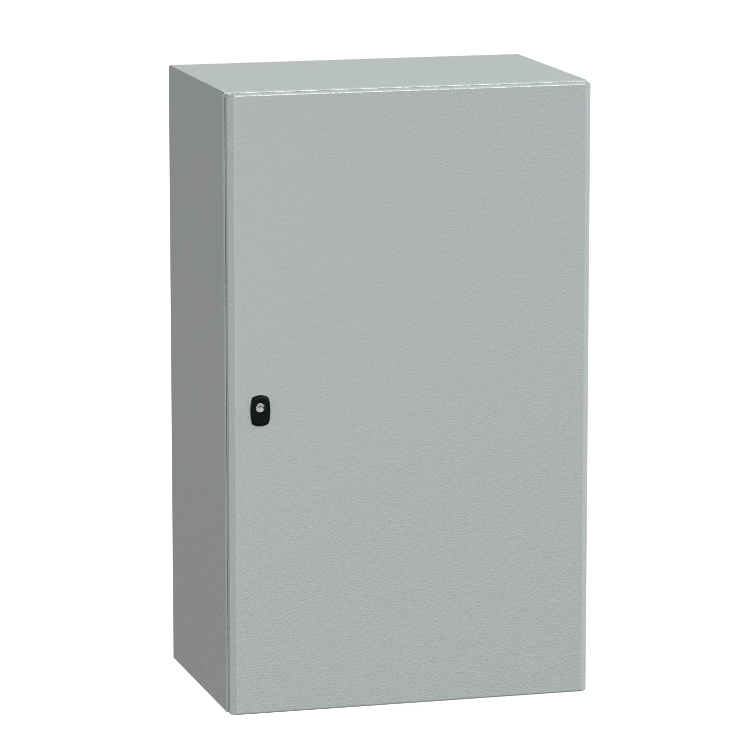 Spacial S3D wall mounted steel enclosure with plain door. 1000 x 600 x 400 mm. Single piece body, mounting plate and 1 cable gland plate included. 3-point closure system with handle and 3 mm double bar lock insert. Steel made, epoxy-polyester powder finish. Protection IP 66, IK10, Grey RAL 7035. · · · Spacial S3D wall mounted steel enclosure with plain door. · · 1000 x 600 x 400 mm. · · Single piece body, mounting plate and 1 cable gland plate included. · · 3-point closure system with handle and 3 mm double bar lock insert. · · Steel made, epoxy-polyester powder finish. · · Protection IP 66, IK10, Grey RAL 7035.