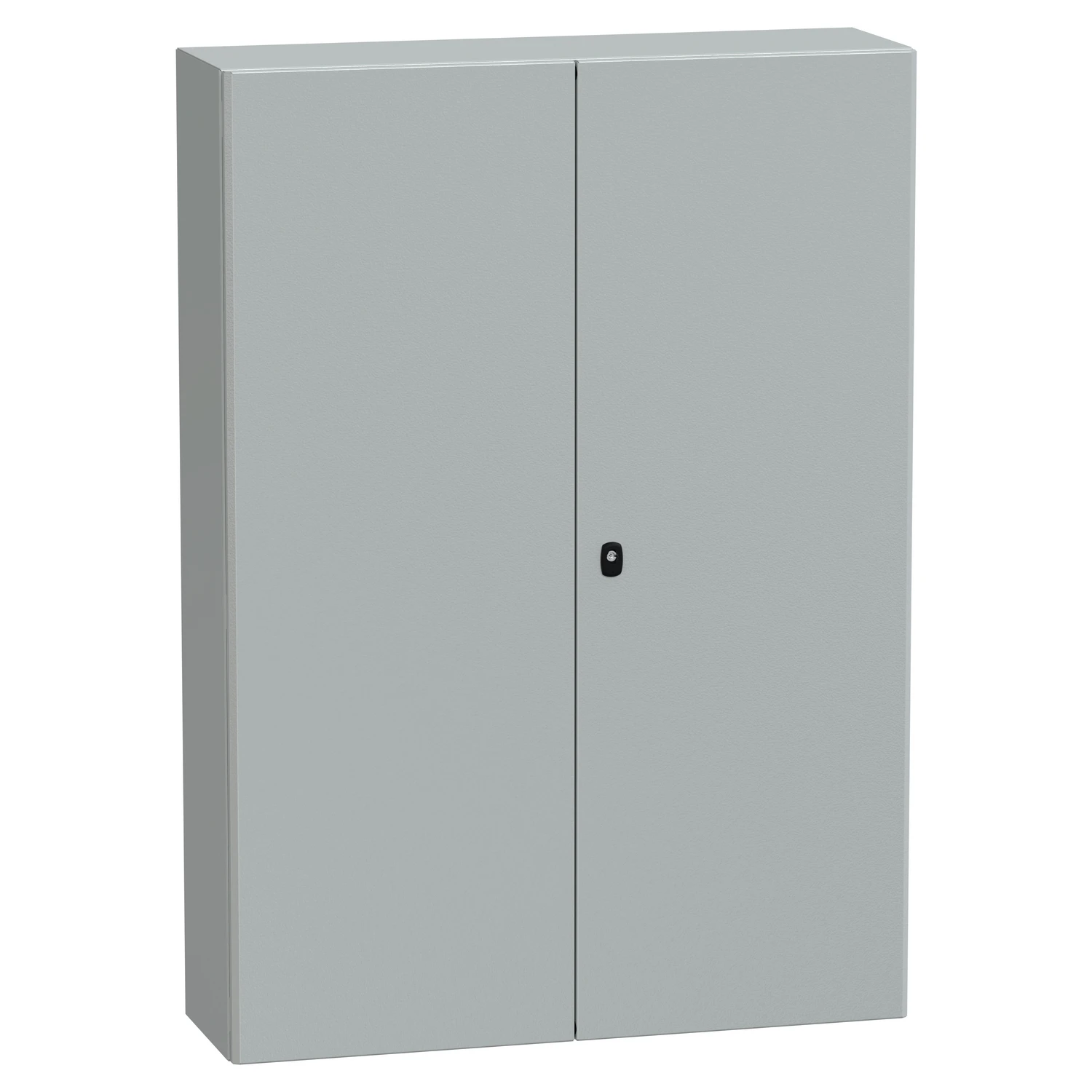 Spacial S3D wall mounted steel enclosure with 2 plain doors. 1400 x 1000 x 300 mm. Single piece body, mounting plate and 2 cable gland plate included. Gutter-shaped front rail double sheet thickness. 3-point closure system with handle and 3 mm double bar lock insert. Steel made, epoxy-polyester powder finish. Protection IP 55, IK10, Grey RAL 7035. · · · Spacial S3D wall mounted steel enclosure with 2 plain doors. · · 1400 x 1000 x 300 mm. · · Single piece body, mounting plate and 2 cable gland plate included. · · Gutter-shaped front rail double sheet thickness. · · 3-point closure system with handle and 3 mm double bar lock insert. · · Steel made, epoxy-polyester powder finish. · · Protection IP 55, IK10, Grey RAL 7035.