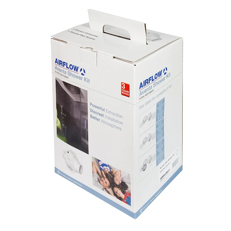 Less bulky than larger in-line centrifugal fans, the Aventa Shower Kit can be installed in loft spaces or service shafts for remote extraction. · · · In-line mixed flow fan · · Designed for ducted installations · · High pressure, low noise · · Compact and quiet in operation · · Two speed (normal and boost) · · Access to motor and impeller without dismantling ductwork · · Low watt motor from 25W · · IPX4 rating · · Adjustable overrun timer · · Complies with Building Regulations