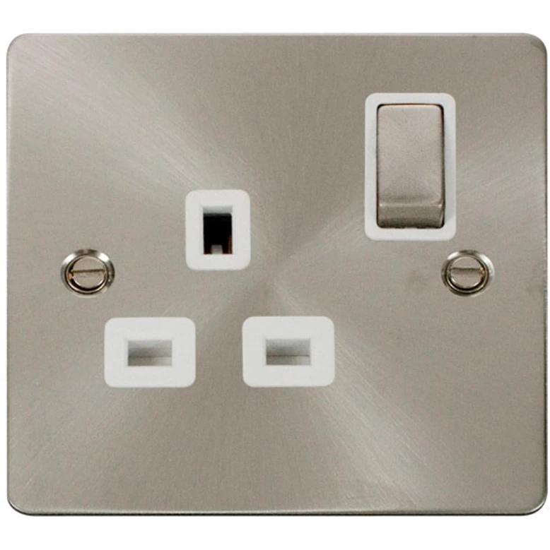 Scolmore International FPBS535WH Define Socket 1 Gang DP Switched 13A Brushed Stainless White Insert · · · Product: Socket Outlet · · Qualifier: Low Voltage · · Switched/Unswitched: Switched · · Gangs: 1 Gang · · Includes 13A Switch Socket?: Y · · Pole Configuration: DP · · Ingress Protection: IP20 · · Body Material: Steel · · Face Colour: Brushed Stainless Steel · · Insert Colour: White