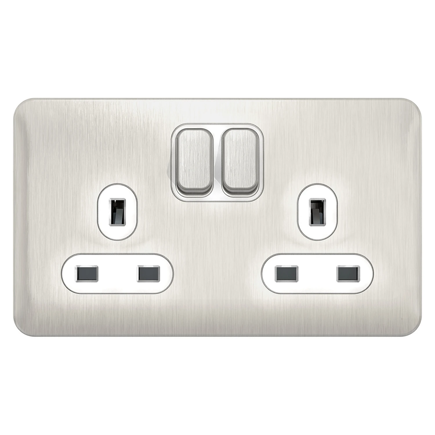Socket 2 Gang Single Pole Switched White Insert 13A Stainless Steel