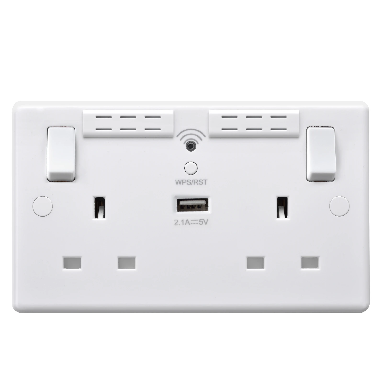 BG Nexus double switched 13A power socket WiFi extender and a Type A USB port. · · · White moulded round edge, sleek and slim with softly rounded edges · · 1x 2.1A USB outlet for charging your mobile devices · · Improved Wi-Fi coverage throughout your home · · Works with all wireless broadband routers · · Easy to install and setup with one touch WPS · · N300 Wi-Fi Technology – Up to 300Mbps data transfer speed · · Perfect for streaming music and videos or playing online games · · Suitable for Computers, Tablets, Mobile Phones, Games Consoles, TVs · · Single band (2.4Ghz) · · No plug-in adapters – keeps socket free for use