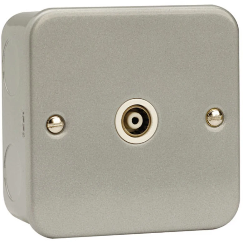 Scolmore Metal Clad Single Isolated Coaxial Plate isolated to filter out any interference. · · · 1 x Isolated Coaxial Outlet · · Back Box Depth 40mm Supplied · · Back Box Knockouts 5 x 20mm (2 on top, 1 on bottom, 1 on each side) · · Warranty 10 Years