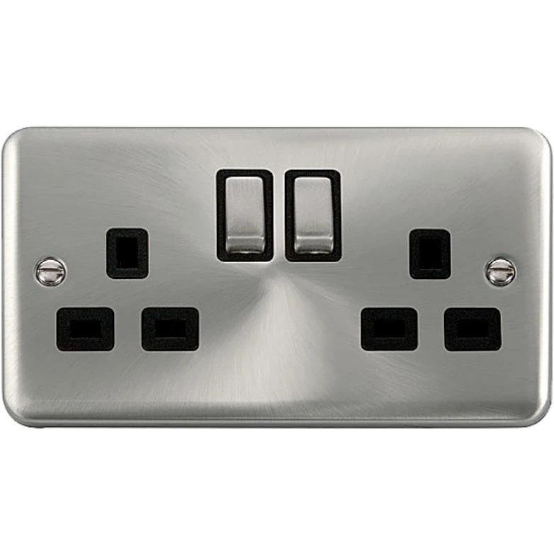 Deco plus rounded profile satin chrome black insert 13A ingot 2 gang double pole switched socket outlet. · · · Dimensions 146mm (W) x 88mm (H) x 8mm (D) · · Plate Design & Finish Rounded Profile Satin Chrome · · Insert & Gasket Colour Black · · Front Plate: Stainless Steel · · Maximum Voltage 250V · · Load Rating 13A · · Plate Fixing Centres 120.6mm · · Terminal Size 5mm · · Terminal Torque 2.5Nm · · Double Pole Yes