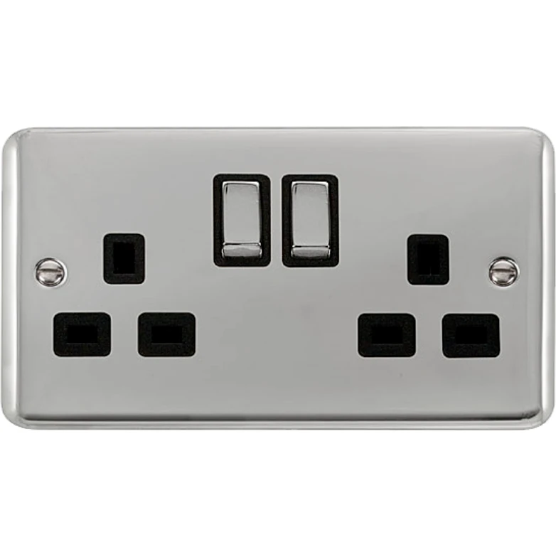 Deco plus rounded proflie polished chrome black insert13A ingot 2 gang double pole switched socket outlet. · · · Dimensions 146mm (W) x 88mm (H) x 8mm (D) · · Plate Design & Finish Rounded Profile Polished Chrome · · Insert & Gasket Colour Black · · Front Plate: Stainless Steel · · Maximum Voltage 250V · · Load Rating 13A · · Plate Fixing Centres 60.3mm · · Terminal Size 5mm · · Terminal Torque 2.5Nm · · Double Pole Yes