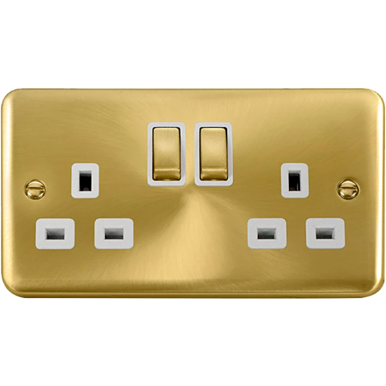 Deco plus rounded profile satin brass white insert 13A ingot 2 gang double pole switched socket outlet. · · · Dimensions 146mm (W) x 88mm (H) x 8mm (D) · · Plate Design & Finish Rounded Profile Satin Brass · · Insert & Gasket Colour White · · Front Plate: Stainless Steel · · Maximum Voltage 250V · · Load Rating 13A · · Plate Fixing Centres 120.6mm · · Terminal Size 5mm · · Terminal Torque 2.5Nm · · Terminal Capacity 4 x 2.5mm