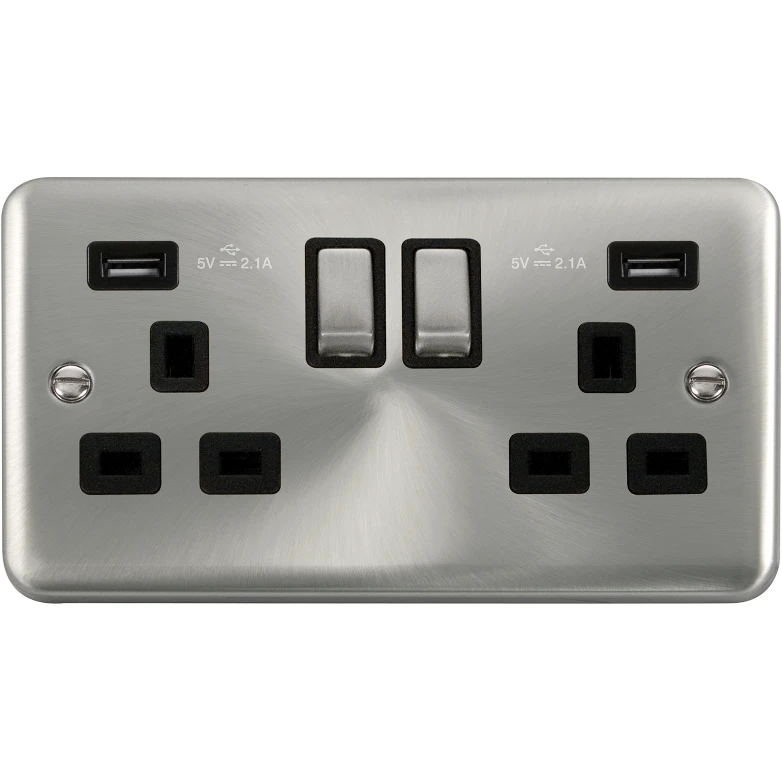 Deco plus 13a ingot 2 gang switched socket outlet with twin usb (total 4.2a) outlets. · · · Style Rounded Profile · · Finish Satin Chrome · · Insert Colour Black · · Gasket Colour Black