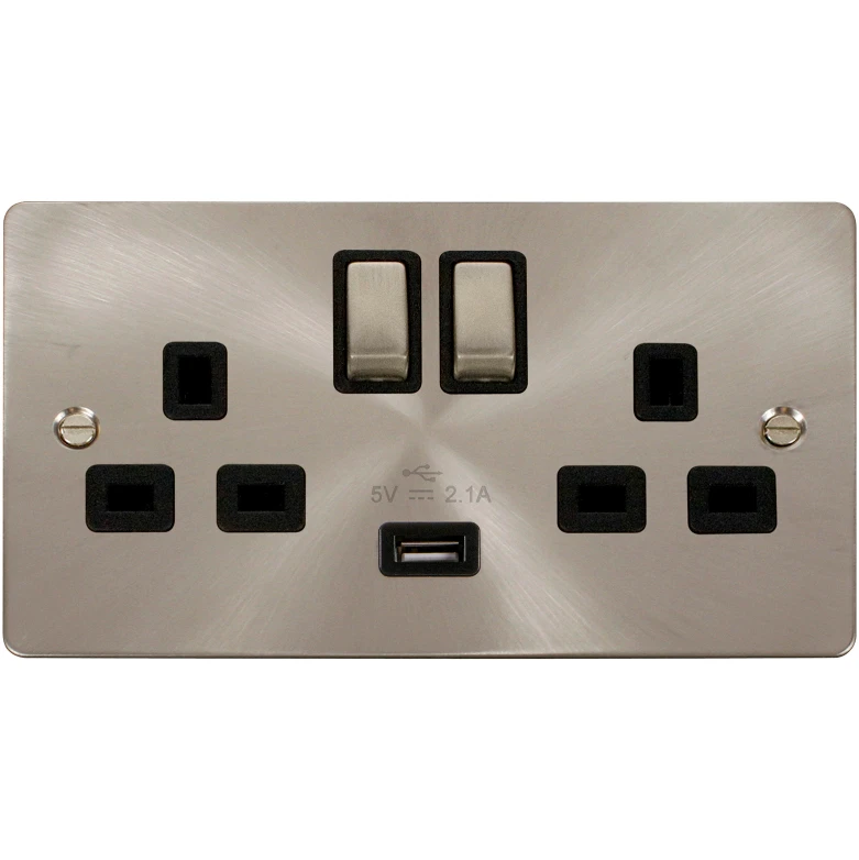 Define flat plate brushed stainless black insert 13A ingot 2 gang switched socket outlet with single 2.1A USB outlet. · · · Plate Dimensions (mm) 146 (W) x 88 (H) x 1.3 (D) · · Plate Fixing Centres – Horizontal (mm) 120.6 · · Style Flat Plate · · Finish Brushed Stainless · · Insert Colour Black · · Gasket Colour Transparent (Neoprene) · · Front Plate: Stainless Steel · · Anti Microbial Certified No · · Rated Voltage (V) (Ue) 250 · · Resistive Load Rating (A) 13