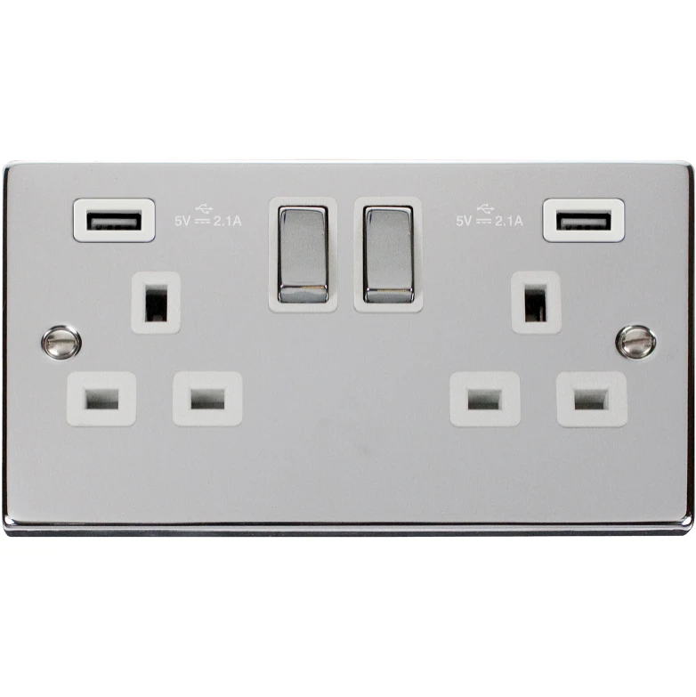 Scolmore International VPCH580WH Deco Socket Ingot 2G Swd c/w Twin USB Outlet 13A 2×2.1A Polished Chrome White Insert Victorian · · · Product: Socket Outlet · · Type: with USB Outlet · · Switched/Unswitched: Switched · · Gangs: 2 Gang · · Includes 13A Switch Socket?: Y · · Includes RCD?: N · · Neon Indicator: N · · Pole Configuration: Double Pole (2P) · · Flex Outlet: N · · Fuse Fitted: N