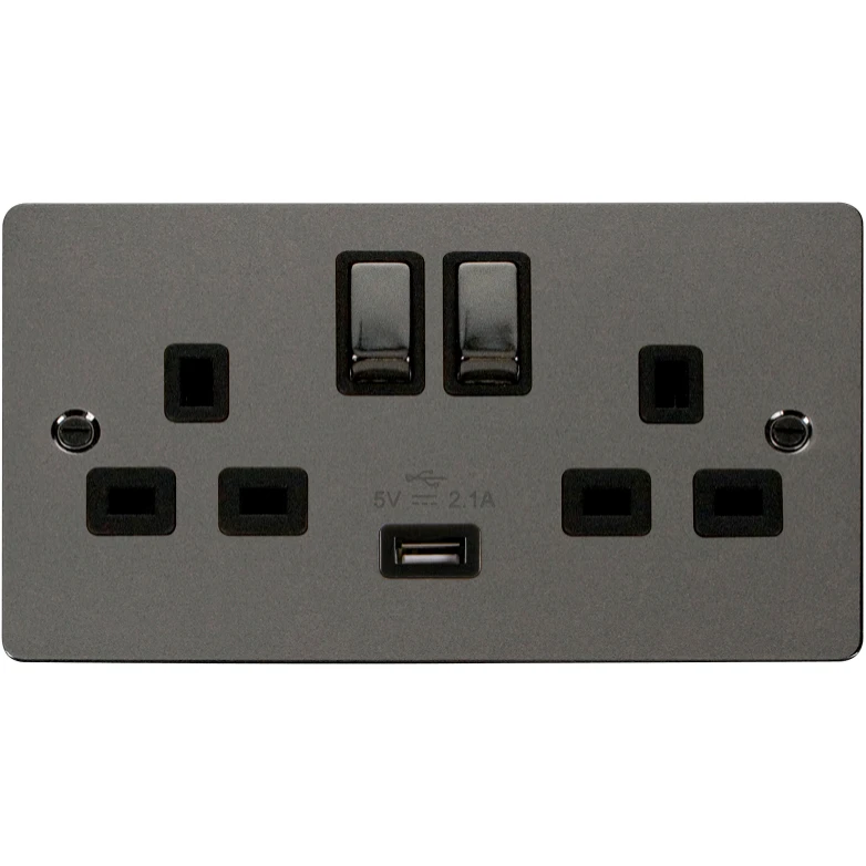 Define flat plate black nickel black insert 13A ingot 2 gang switched socket outlet with single 2.1A USB outlet. · · · Plate Dimensions (mm) 146 (W) x 88 (H) x 1.3 (D) · · Plate Fixing Centres – Horizontal (mm) 120.6 · · Style Flat Plate · · Finish Black Nickel · · Insert Colour Black · · Gasket Colour Transparent (Neoprene) · · Anti Microbial Certified No · · Rated Voltage (V) (Ue) 250 · · Resistive Load Rating (A) 13 · · USB Output Type USB Type “A”