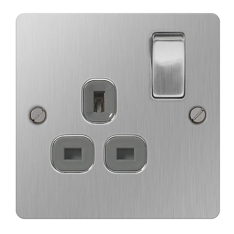 Socket Switched 1 Gang DP 13A Stainless Steel Brushed Grey Insert